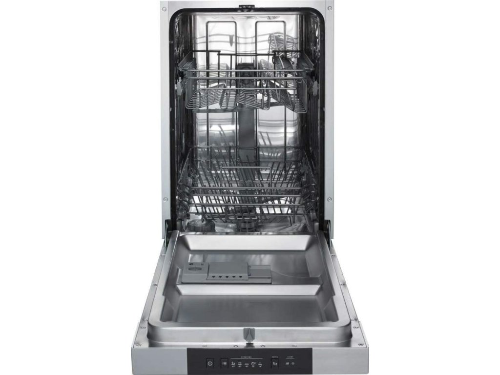 Vestavná myčka nádobí 45 cm s čelním panelem, Energetická třída E, Kapacita 9 sad nádobí, Spotřeba energie: 70 kWh na 100 cyklů, Maximální hlučnost: 47 dB, Spotřeba vody 9 na mycí cyklus, Počet programů: 5, AquaStop funkce, Výška: 81,5 cm, Šířka: 44,8 cm,