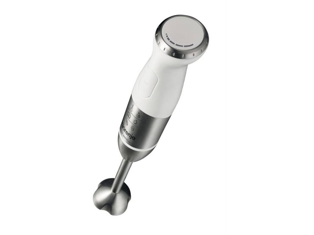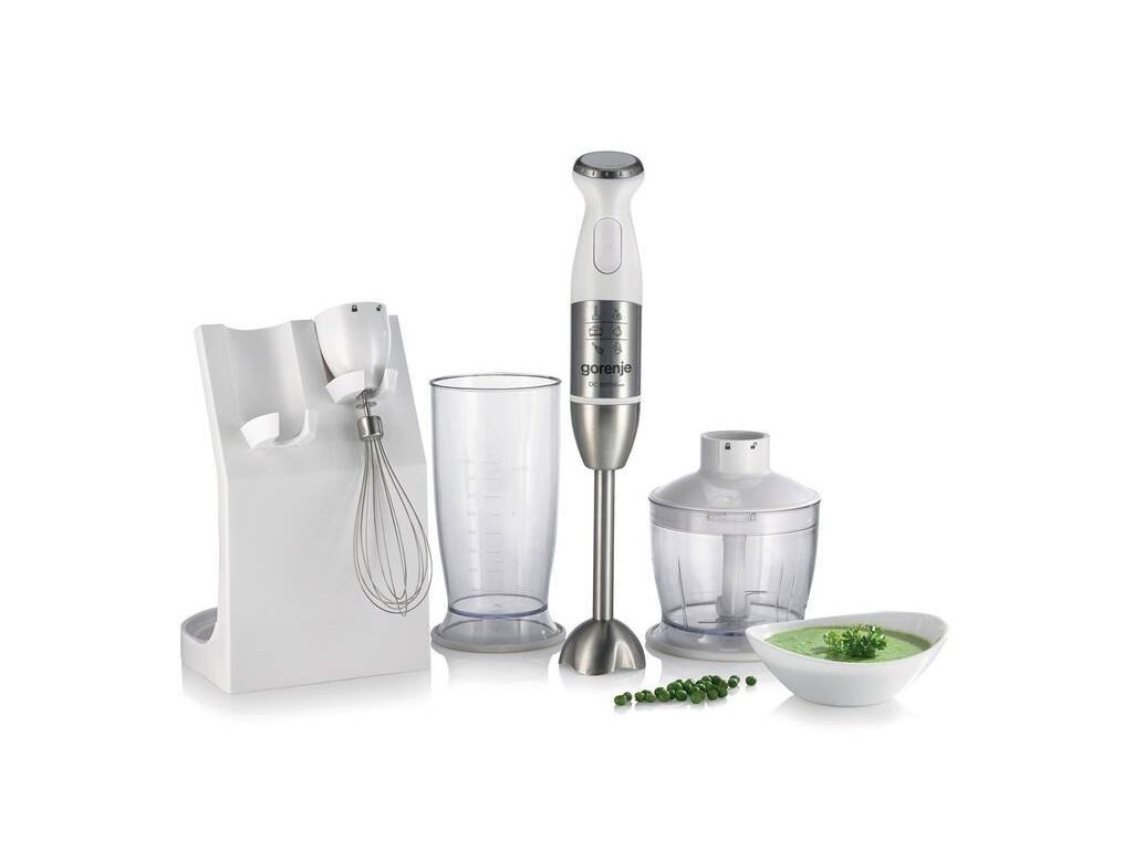 Tyčový mixér, DC motor s příkonem 800 W, 4 břitá čepel, plynulé nastavení rychlosti, mixovací noha z nerez oceli, šlehací metla, mixovací nádoba 0,5 l, sekací nádoba 0,5 l, stojan, bílá barva