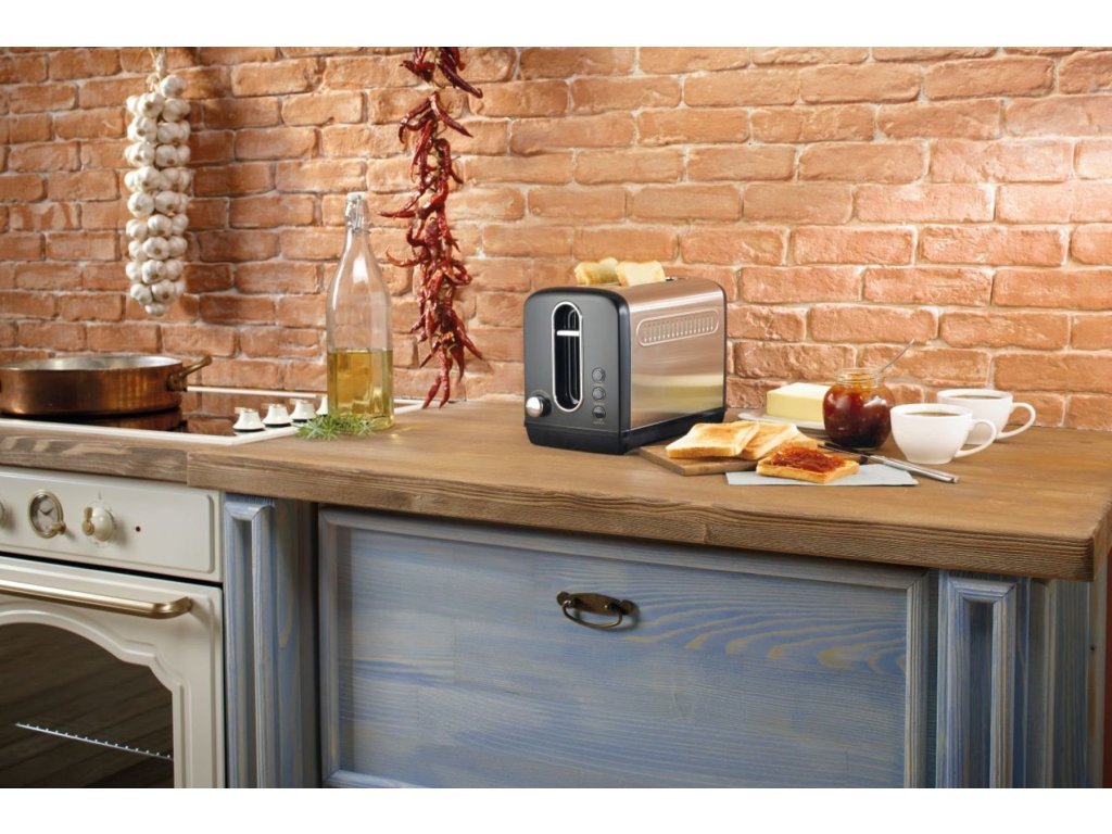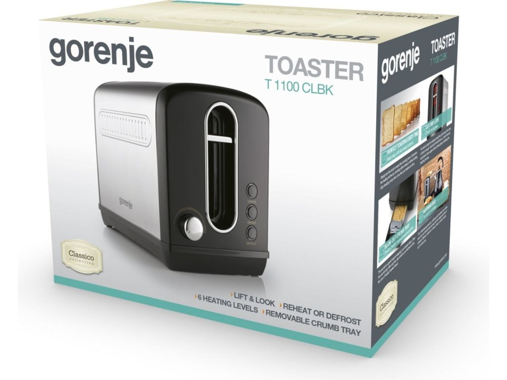 Topinkovač, příkon 1100 W, 6 úrovní ohřevu, autmatické vysunutí topinek, funkce rodmrazování, možnost volby úrovně opečení, přihrádka na drobky