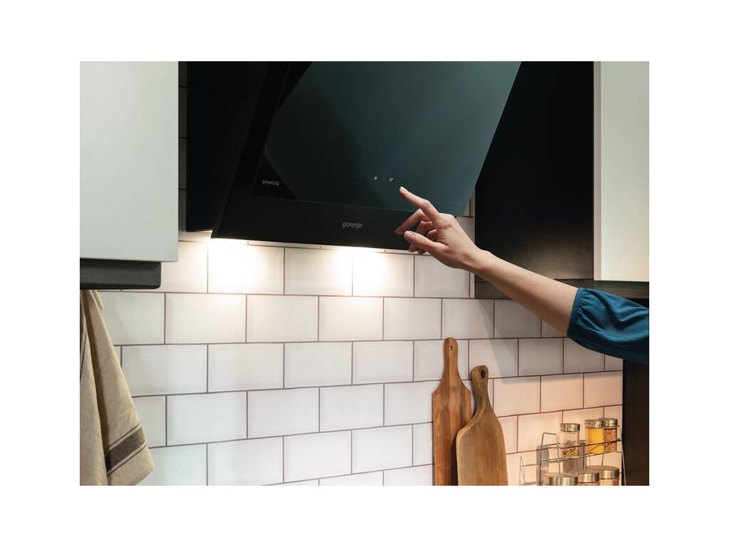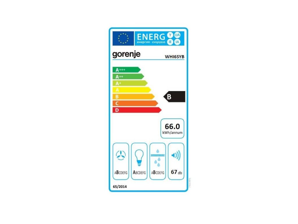Komínový odsavač par Gorenje WHI6SYB v černém provedení je zařazen do energetické třídy B. Má dotykové ovládání, které je umístěno v přední části. Provoz je možný s odtahem nebo recirkulací. Jeho maximální výkon odsávání dosahuje 650 m3/hod, při recirkulaci 488 m3/hod. S průměrem odtahu 15 cm. Nabízí 3 rychlosti odsávání, které se nastavují pomocí dotykového ovládání. Využívá perimetrický systém odsávání, který přesměruje odsávání vzduchu z centrální části do vnějších rohů odsavače. Komínový odsavač má omyvatelný hliníkový filtr s polyuretanovou pěnou, která zachycuje mastnotu. Pracovní plochu pod odsavačem zpřehlední LED osvětlení.
