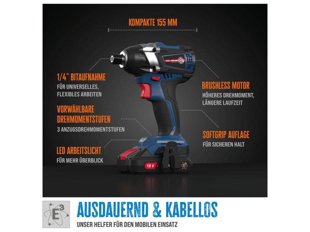 Akumulátorový rázový utahovák ze série akumulátorového nářadí 18V E 3. Elektronika s regulací otáček a ochranou proti přetížení, 3 volitelné stupně utahování, 2 volitelné stupně povolování. Levý/pravý chod s brzdou motoru.