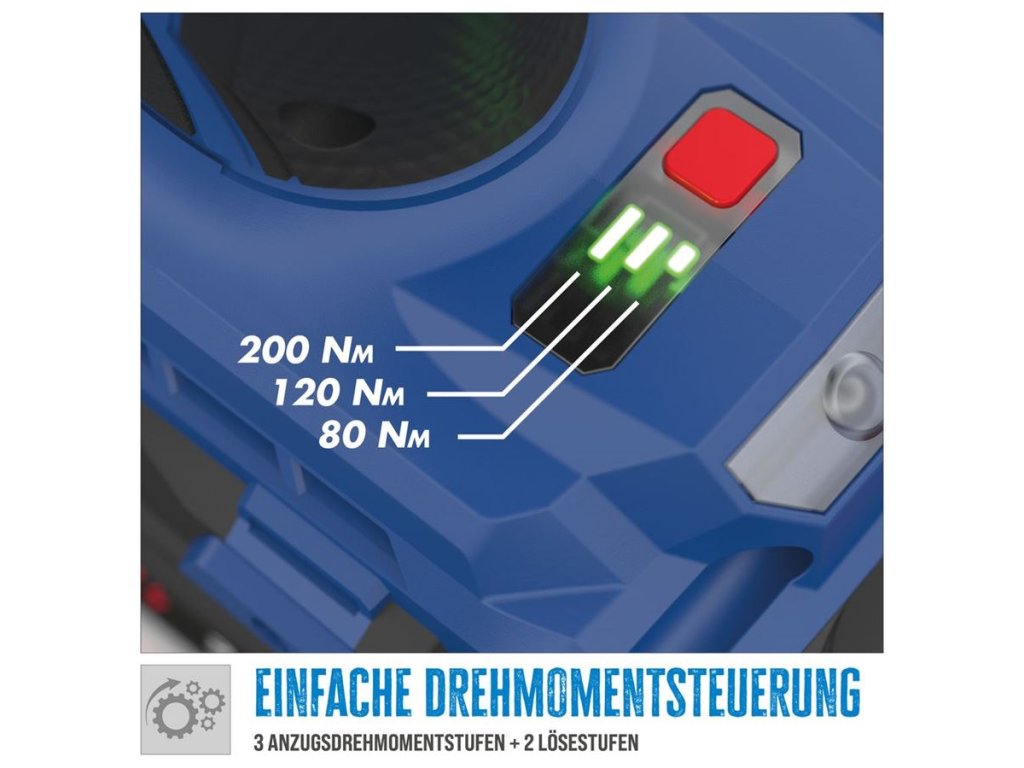 Elektronika s regulací otáček a ochranou proti přetížení, 3 volitelné stupně utahování, 2 volitelné stupně povolování.