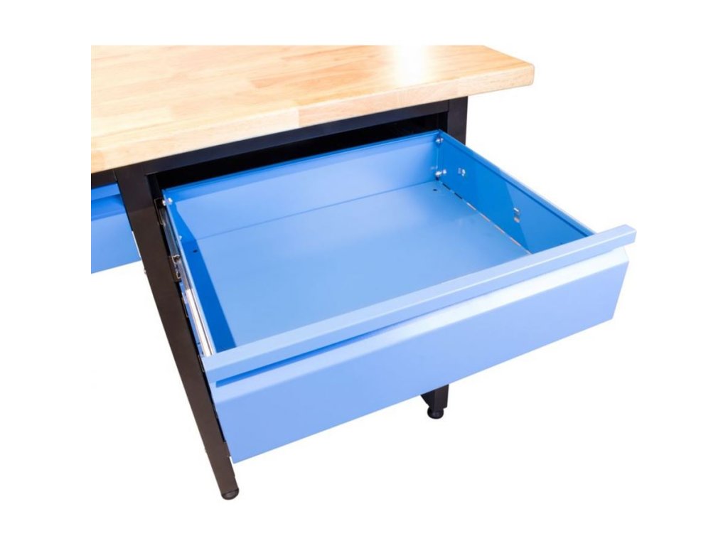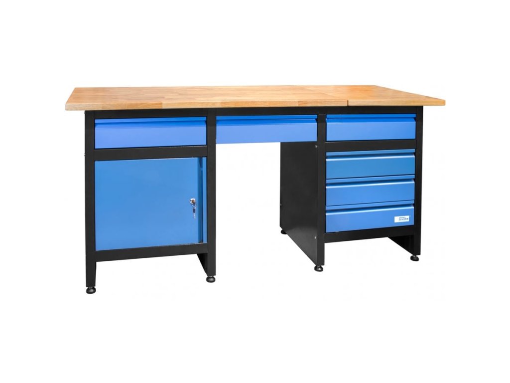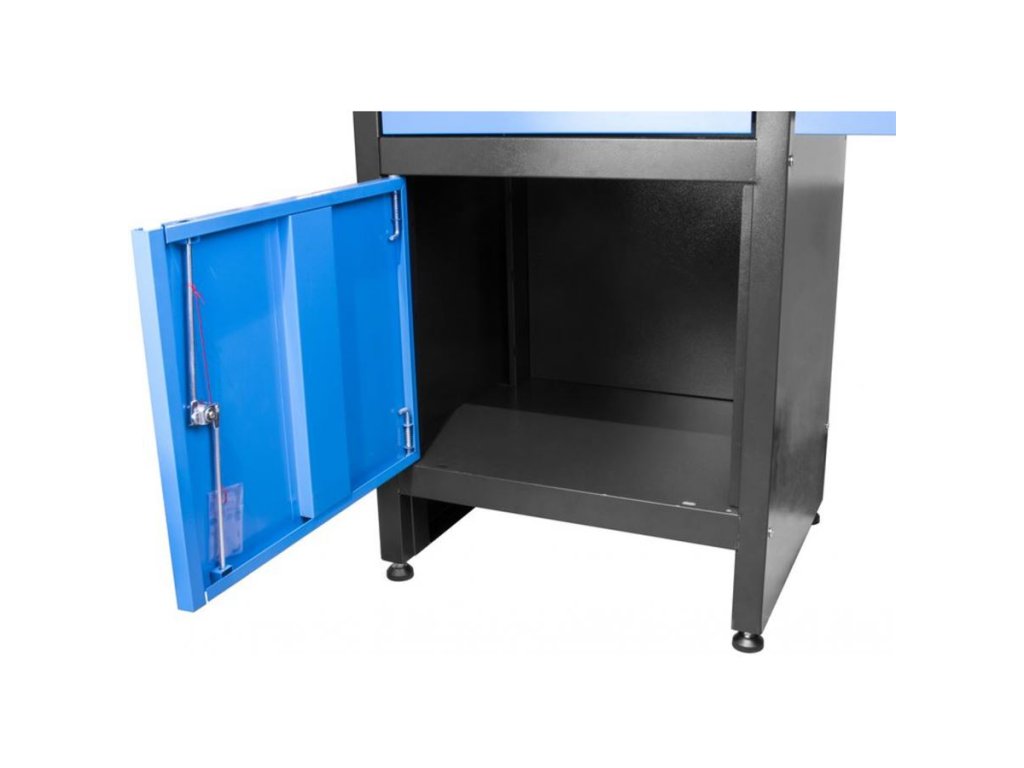 Pracovní stůl, určený k použití v domácích nebo údržbářských dílnách, montážních provozech apod. 6 zásuvek (d x š x v: 440 x 400 x 95 mm; max. nosnost: 25 kg, plně výsuvné - teleskopické vodicí lišty); uzamykatelná dveřová skříňka 465 x 400 x 390mm.