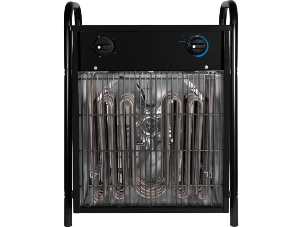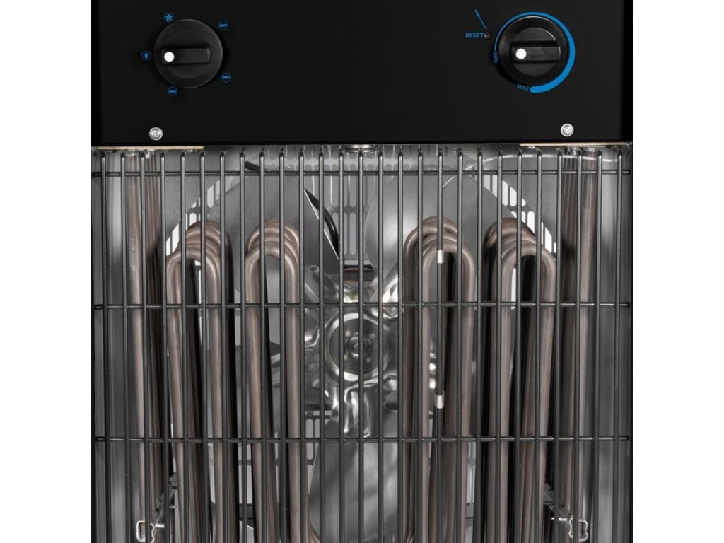 Max. topný výkon: 15 kW (12.900 kcal/hod., 3 topné stupně: 5 kW/10 kW/15 kW), prostorový termostat (automatické zapínání/vypínání topné spirály po dosažení nastavené teploty), ventilátor.