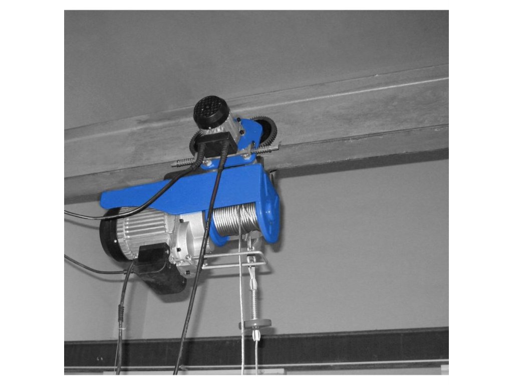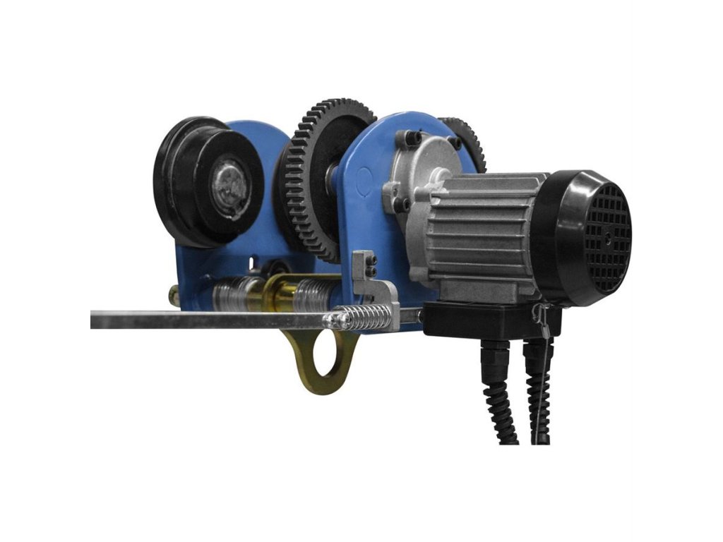 Elektrická jeřábová kočka, určená k horizontálnímu přesouvání řetězových kladkostrojů/lanových zvedáků se zavěšenými břemeny (max. celková hmotnost: 999 kg).