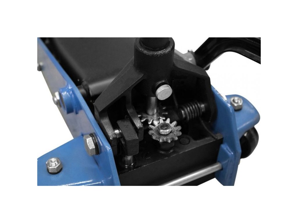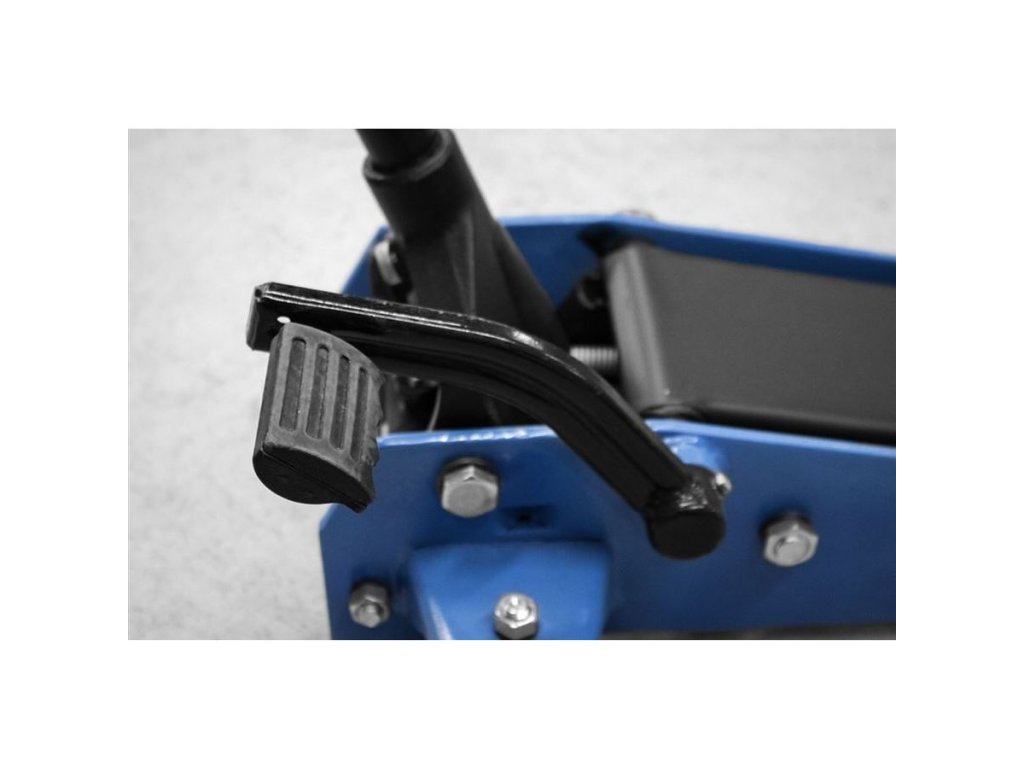 Konstrukce zvedáku je robustní, vyrobená z ocelového rámu, a pro pohodlné ovládání má přídavný nožní pedál.