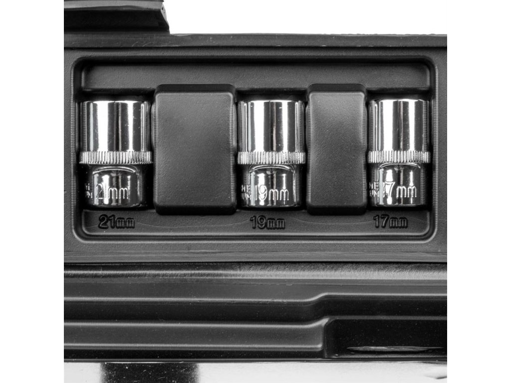 • 3 nástrčné hlavice ve velikostech 17, 19 a 21 mm, vyrobeno z vysoce kvalitní chrom-vanadiové oceli