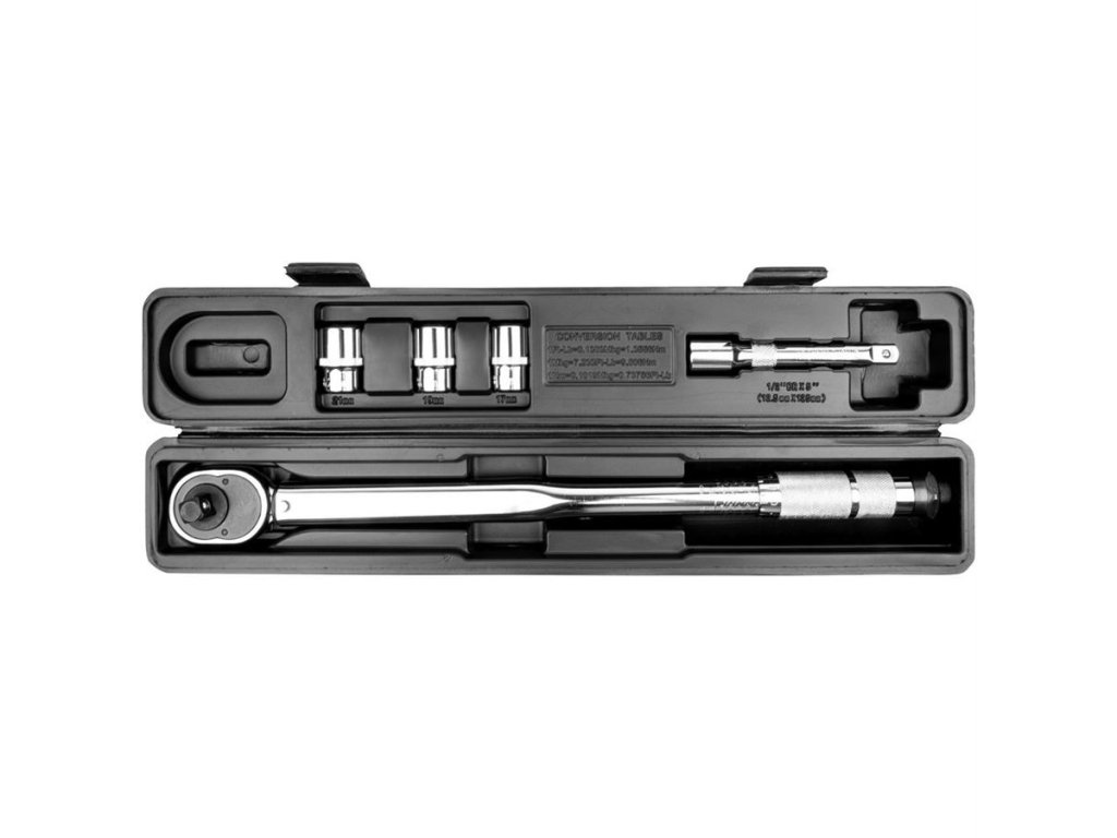 5dílná sada skládající se z 1/2" momentového klíče, 3 nástrčných hlavic a nástavce 125 mm.