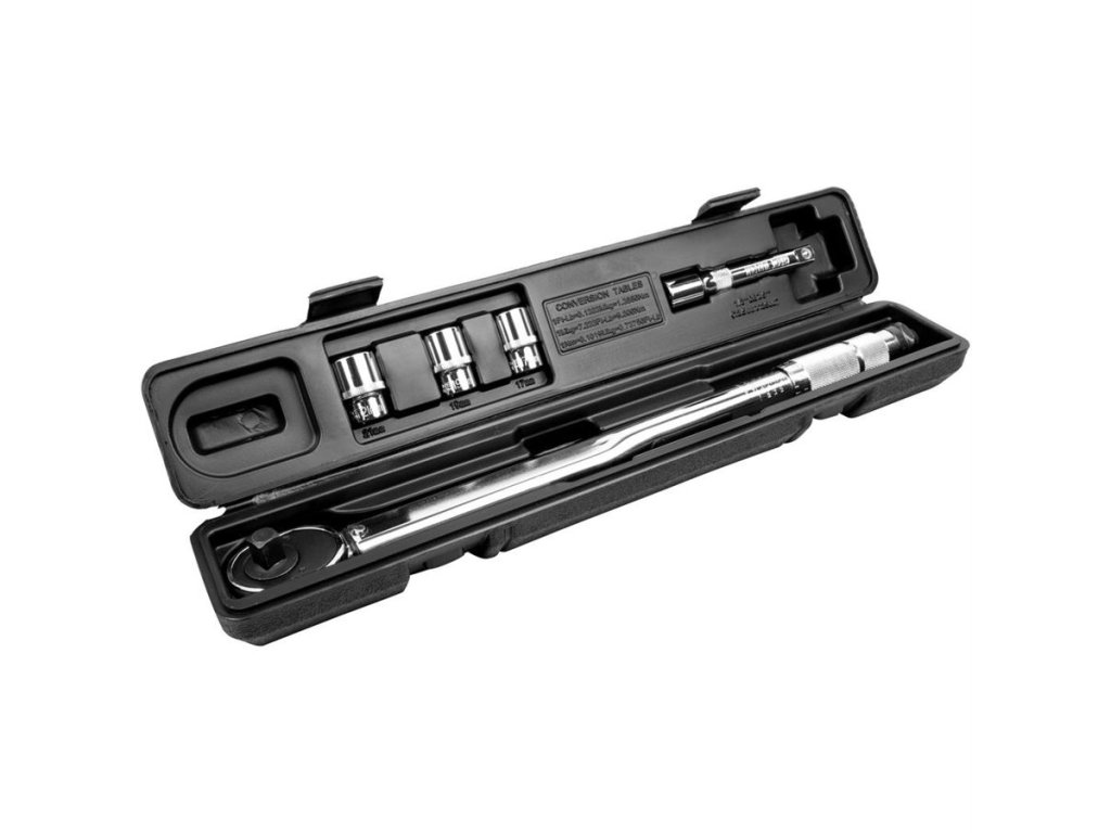 5dílná sada skládající se z 1/2" momentového klíče, 3 nástrčných hlavic a nástavce 125 mm. Rozsah nastavení momentového klíče: 40-210 Nm.