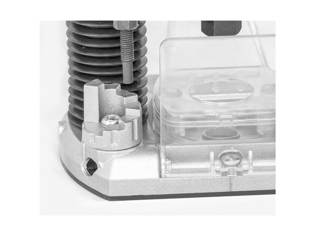 8-stupňová předvolba otáček podle druhu obráběného materiálu (-> rozsah: 11.000 - 30.000 ot./min.), přesné nastavení hloubky řezu 0 - 55 mm, aretace hřídele pro snadnou/rychlou výměnu fréz.
