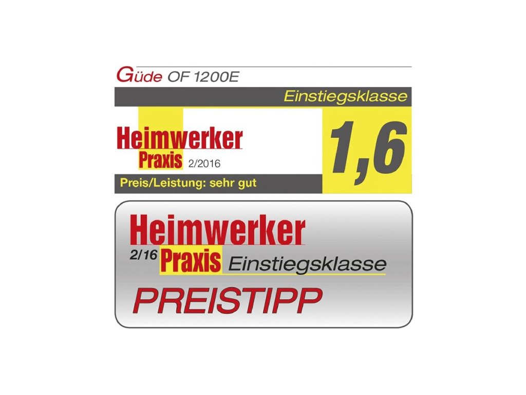 Příslušenství: frézy (6), upínací kleštiny (-> průměr: 6/8 mm), podélný doraz s vodícími tyčemi, středicí kolík frézovacího kružítka, kopírovací kroužek, stranový klíč.