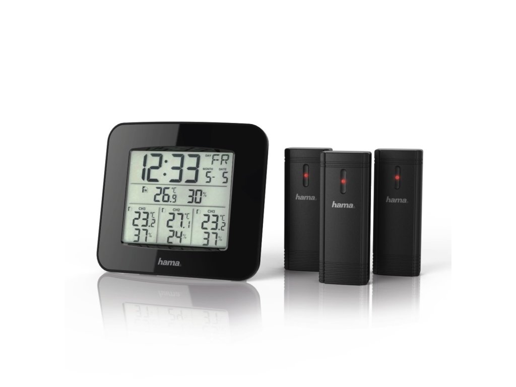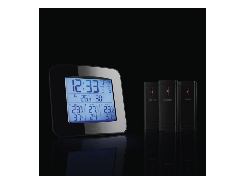 Hama EWS-Trio, digitální meteostanice, 3x bezdrátový senzor, hodiny řízené rádiovým signálem, zobrazení času, data, dne v týdnu, teploty a vlhkosti vzduchu