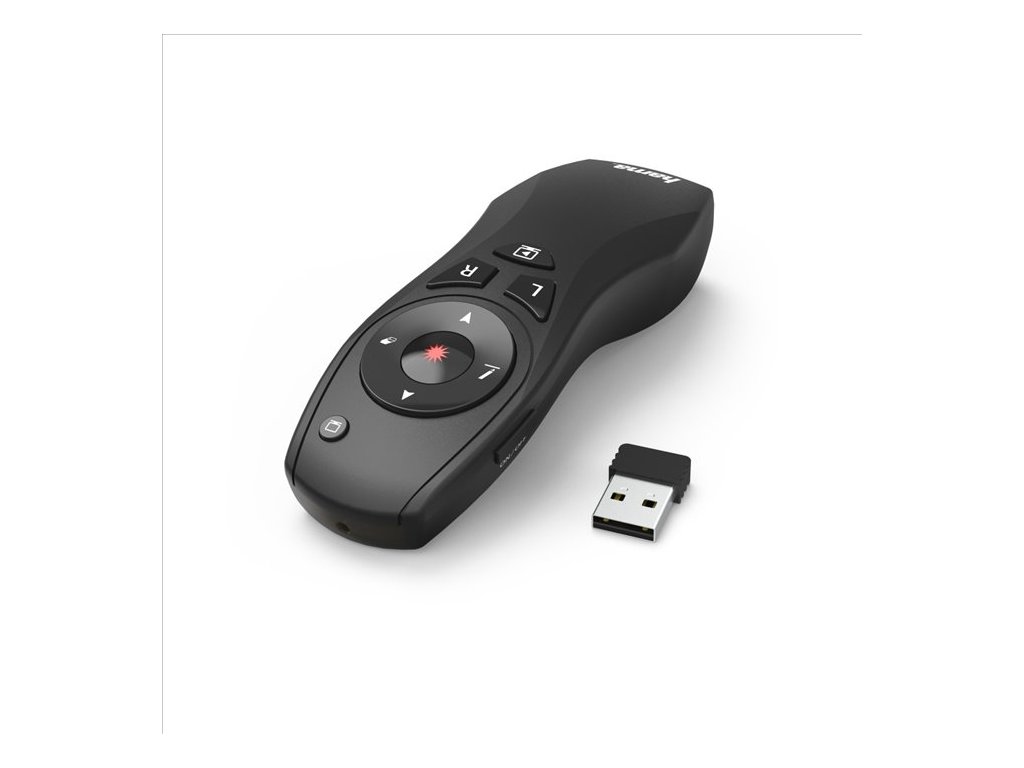 Hama X-Pointer 6v1, bezdrátový ovladač prezentací s funkcí myši pro rozšířené ovládání a podporu během prezentací, integrované červené laserové ukazovátko, miniaturní USB přijímač, dosah až 15 m