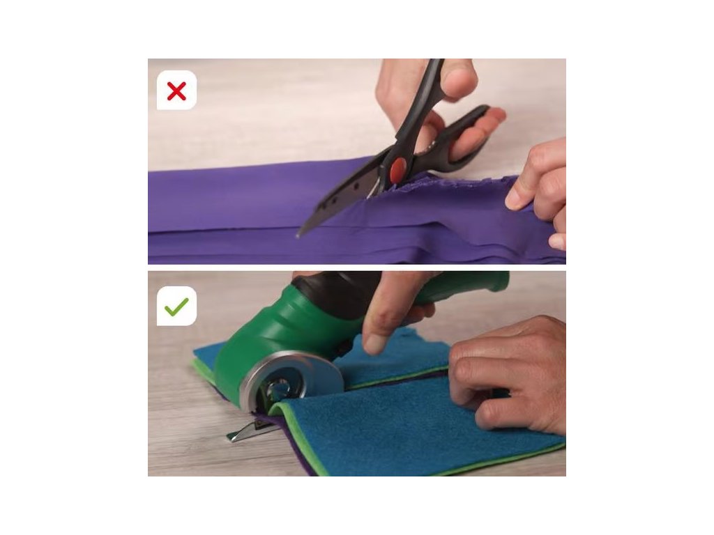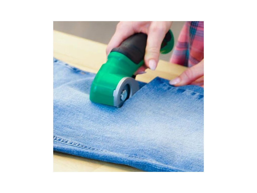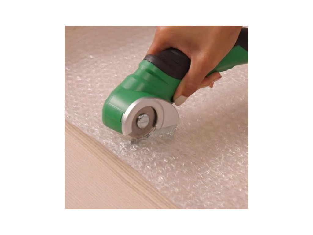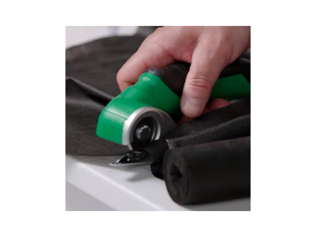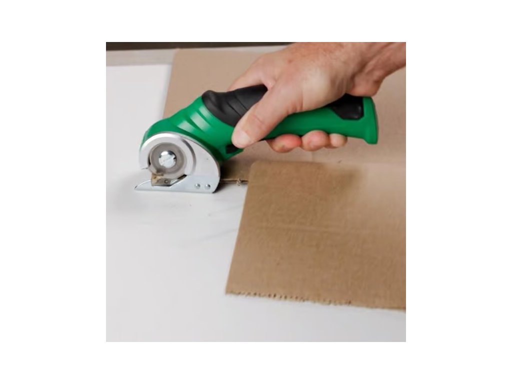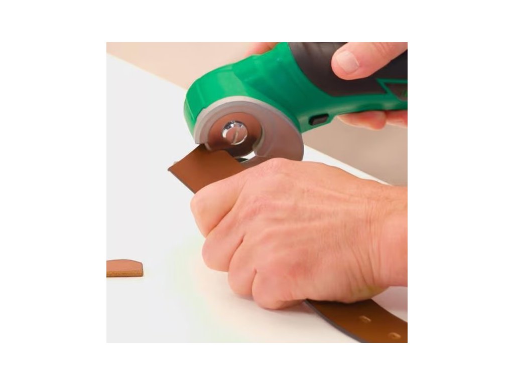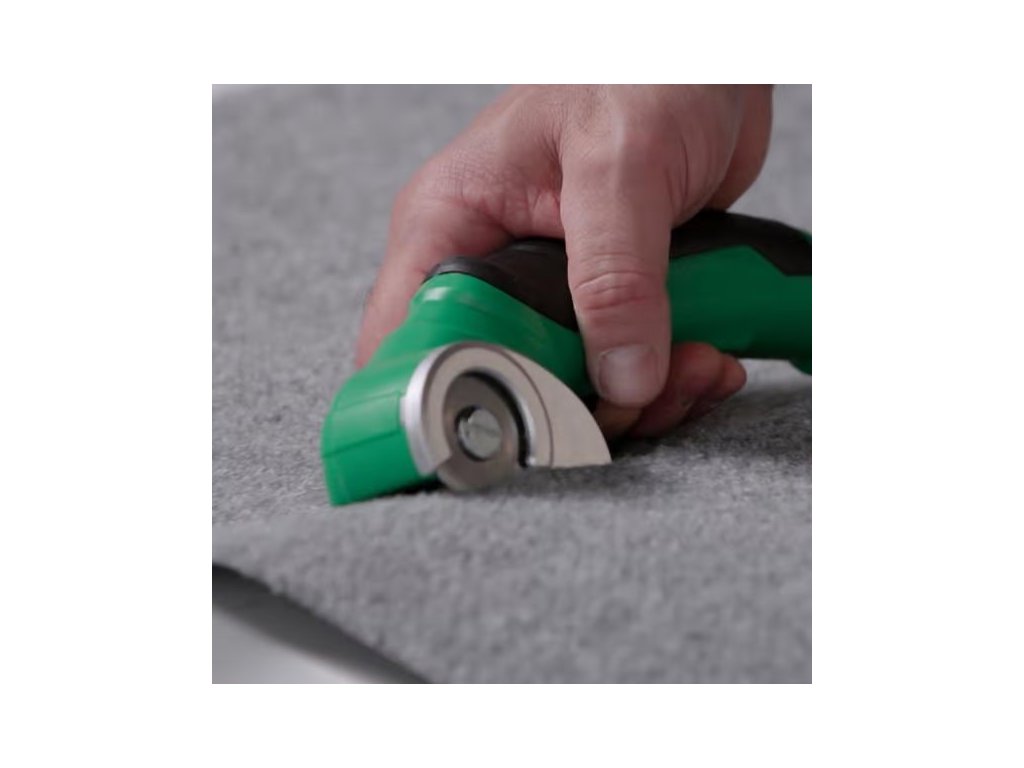 Akumulátorový univerzální řezák, vyměniteln kruhový nůž, na řezání kartonu a obalů, pravé či umělé kůže, PVC krytiny, koberců, tapet a plastu, na materiály o tloušťce až 6 mm, Lehký, pouze 400 g, bezdrátový a dobíjecí.