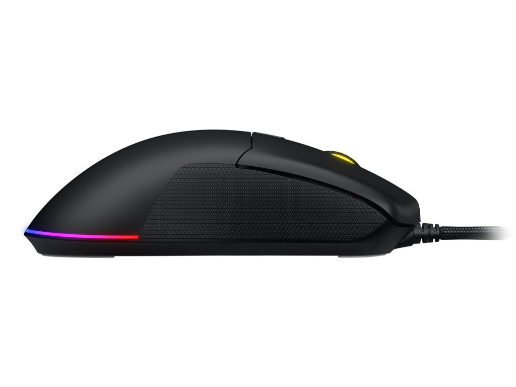 Ultralehká herní myš (62 g) • Symetrický tvar • Senzor PixArt PMW3311 (až 12 000 DPI) • Odolné optické spínače HATOR (100 mil. kliknutí) • RGB osvětlení • 6 programovatelných tlačítek • PTFE kluzné plochy • 1,8m paracord kabel • Černá