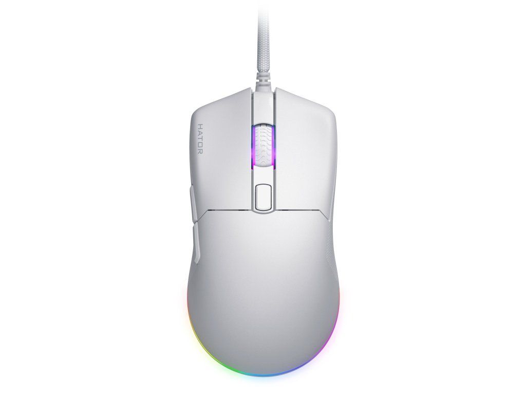 Ultralehká herní myš (62 g) • Symetrický tvar • Senzor PixArt PMW3311 (až 12 000 DPI) • Odolné optické spínače HATOR (100 mil. kliknutí) • RGB osvětlení • 6 programovatelných tlačítek • PTFE kluzné plochy • 1,8m paracord kabel • Bílá