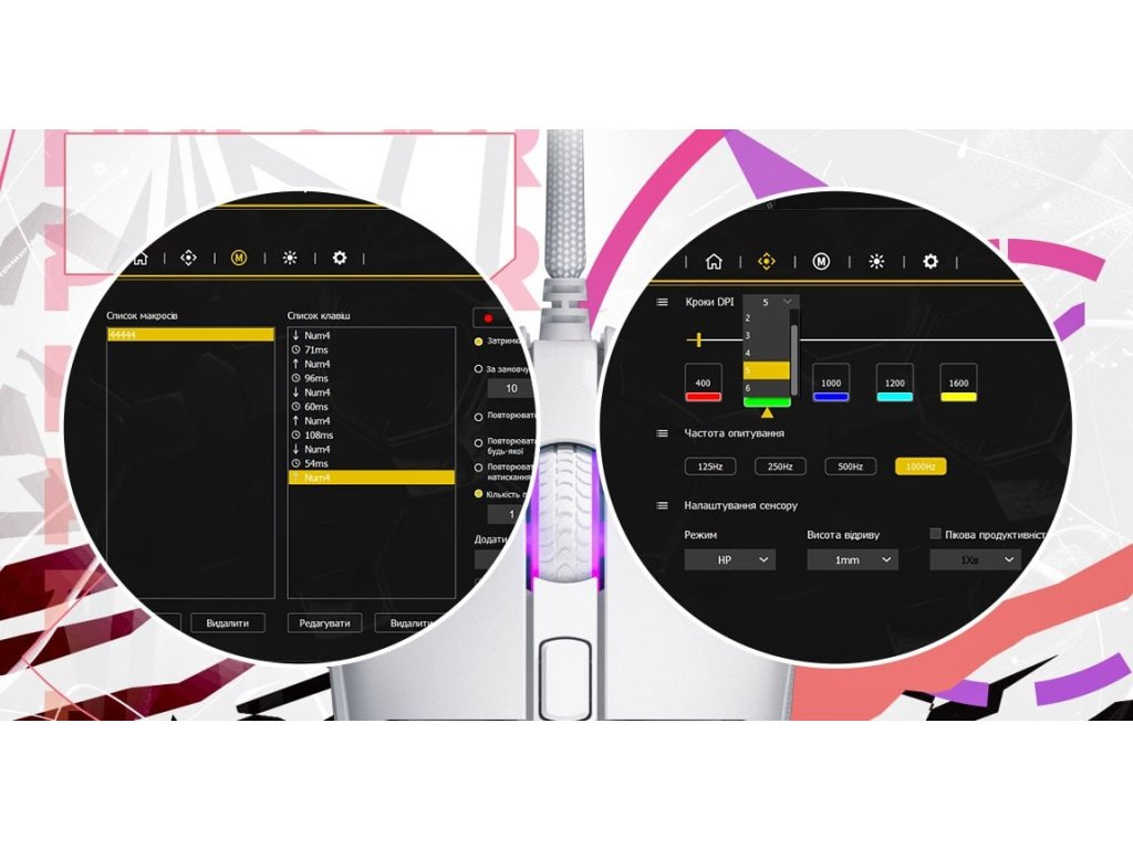 RGB osvětlení: Dvě zóny RGB osvětlení (rolovací kolečko a zadní část myši) umožňují personalizaci designu a indikují nastavenou hodnotu DPI.