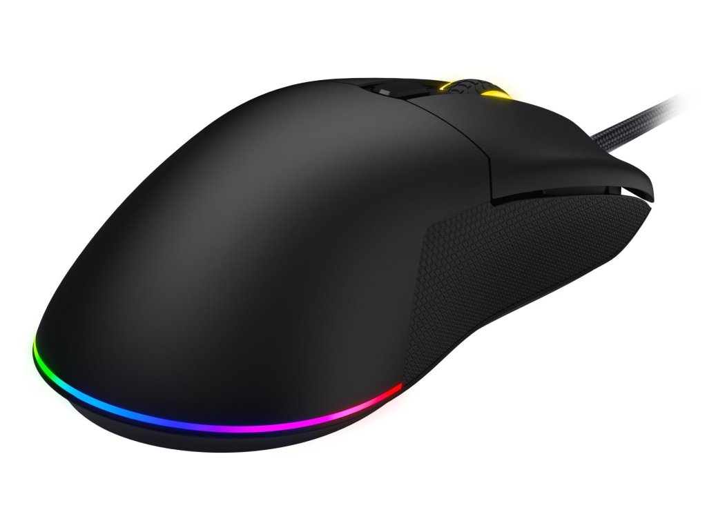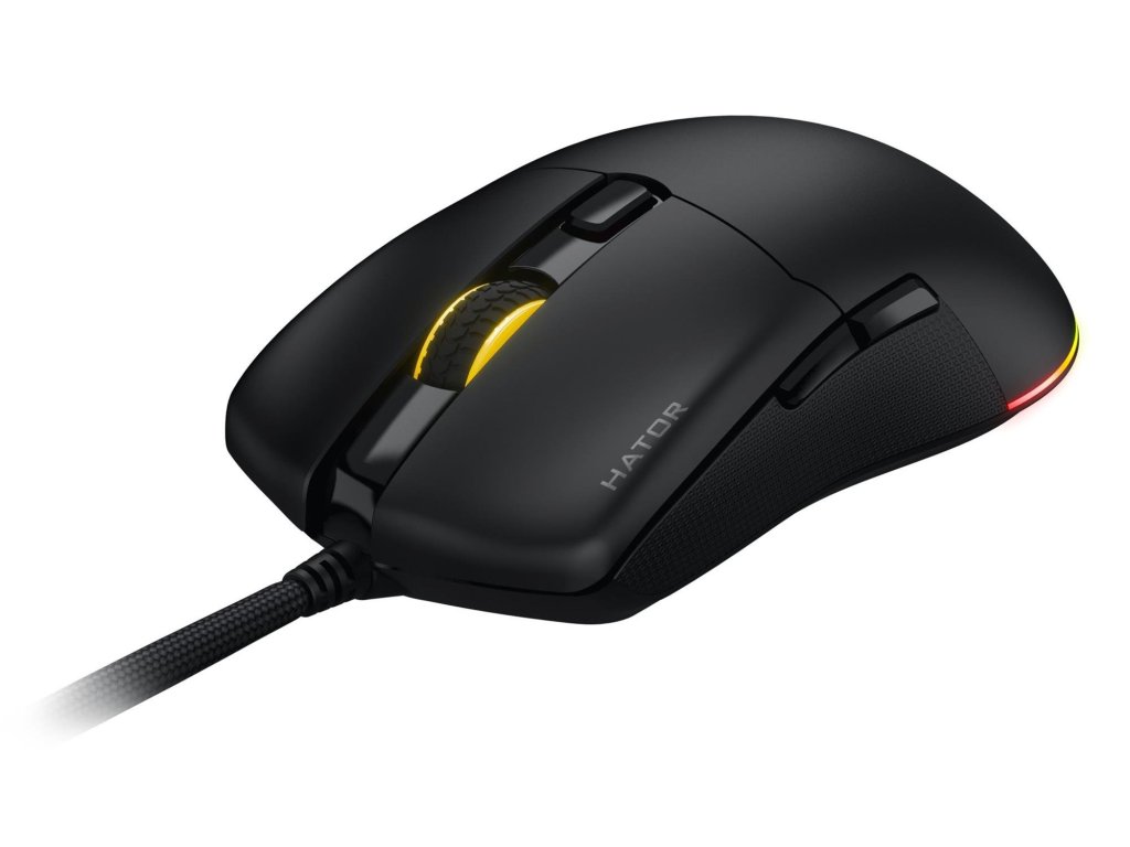 Ultralehká herní myš (62 g) • Symetrický tvar • Senzor PixArt PMW3311 (až 12 000 DPI) • Odolné optické spínače HATOR (100 mil. kliknutí) • RGB osvětlení • 6 programovatelných tlačítek • PTFE kluzné plochy • 1,8m paracord kabel • Černá