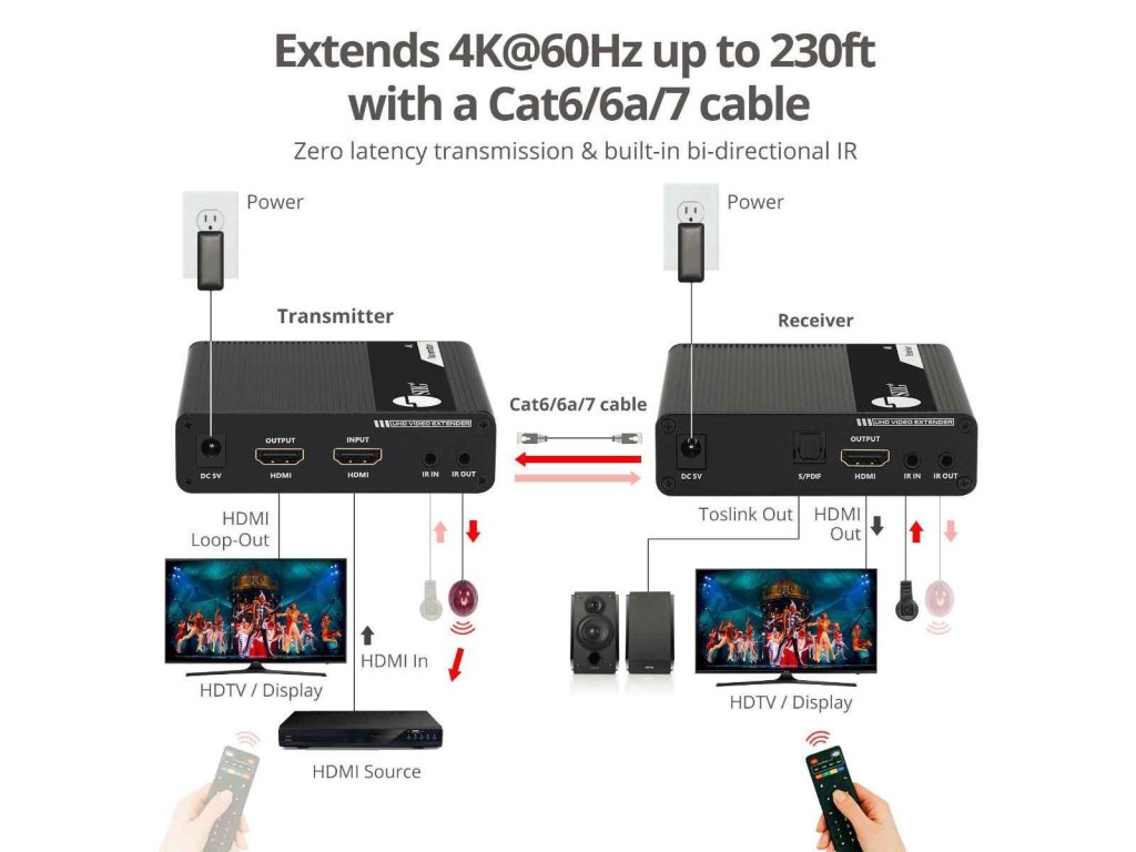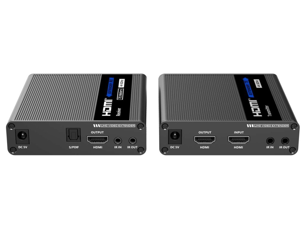 Toto zařízení HDMI Extender umožňuje přenášet signál HDMI na velké vzdálenosti pomocí síťového kabelu CAT6 / 6A / 7. Díky použití síťového kabelu je možné dosáhnout až 70 metrů přenosové délky s rozlišením 4K@60Hz videa.