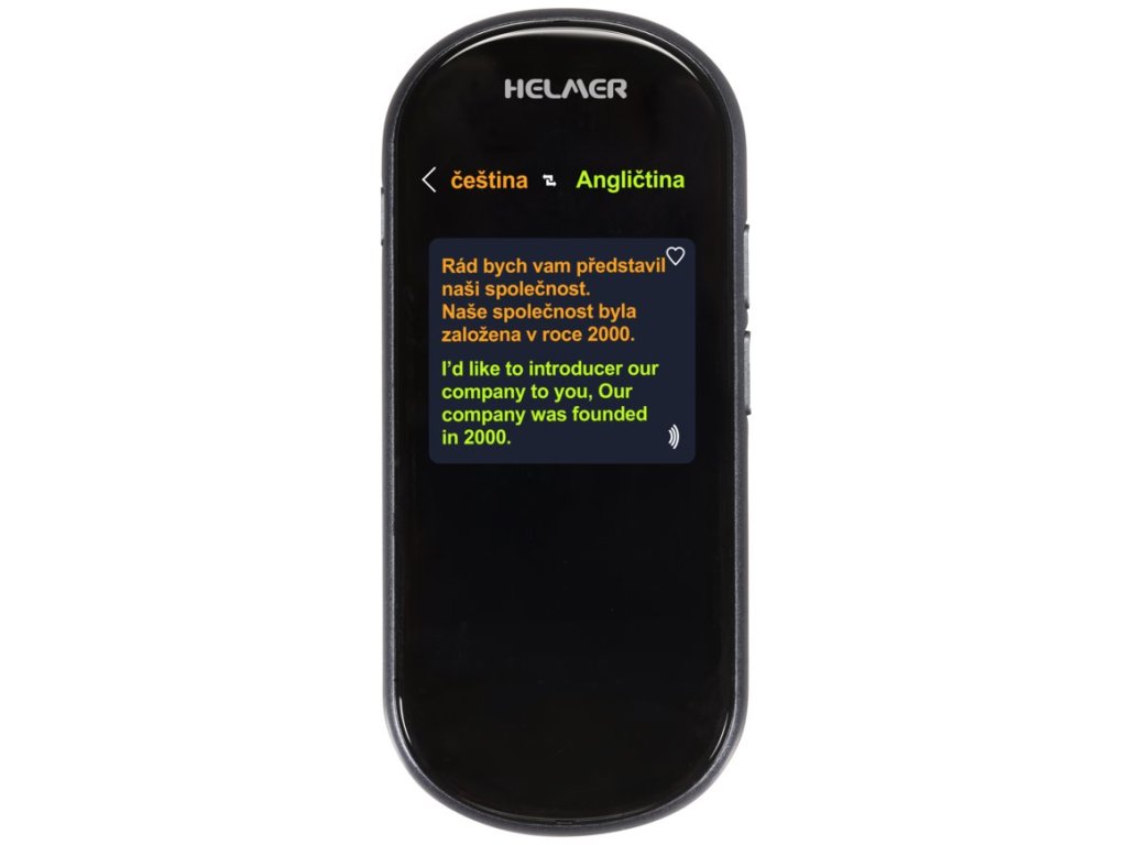 S hlasovým překladačem Helmer OTR 212 se dorozumíte cizím jazykem rychle, jednoduše a bez desítek hodin strávených v učebnicích. Tento model se vyznačuje obousměrným zvukovým překladem, který umožňuje komunikaci až ve 109 jazycích. Inovovaný model navíc dovoluje vložit 4G SIM kartu a překladač využít naprosto všude, kde je dostupný mobilní signál operátora, a to včetně mobilní datové sítě. Kromě toho umožňuje hlasový překladač Helmer OTR 212 bezdrátové připojení skrze síť Wi-Fi, takže převádět mluvený text nebo řeč do cizího jazyka můžete zcela neomezeně. Namluvený text je interpretován s dikcí a přízvukem rodilého mluvčího, aby nedošlo k nechtěnému komunikačnímu šumu. Totožný postup – tedy namluvení řeči nebo textu – použije i druhá osoba.