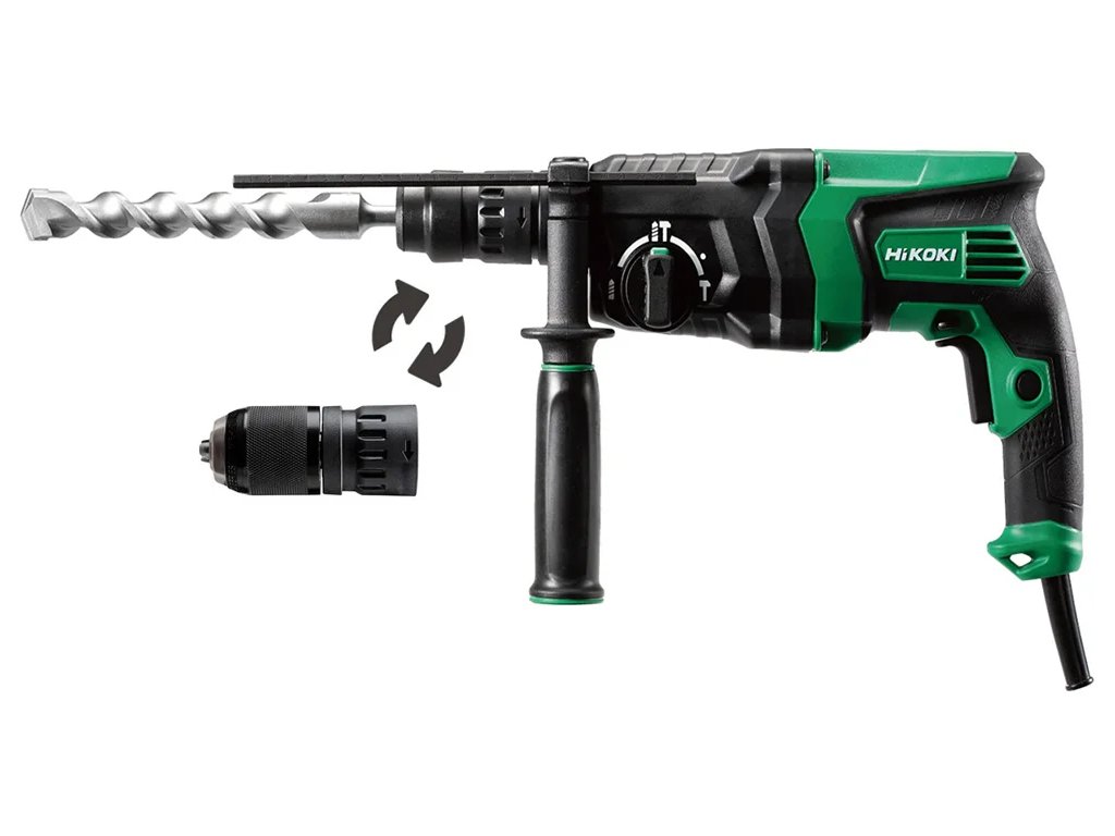 Kombinované kladivo HiKOKI DH26PMCWSZ, výkon 830 W, otáčky 0-1100/min., počet příklepů 0-4300/min., síla úderu 2,9 J, vrtací výkon 13/26/32/50 mm, hmotnost 3 kg.