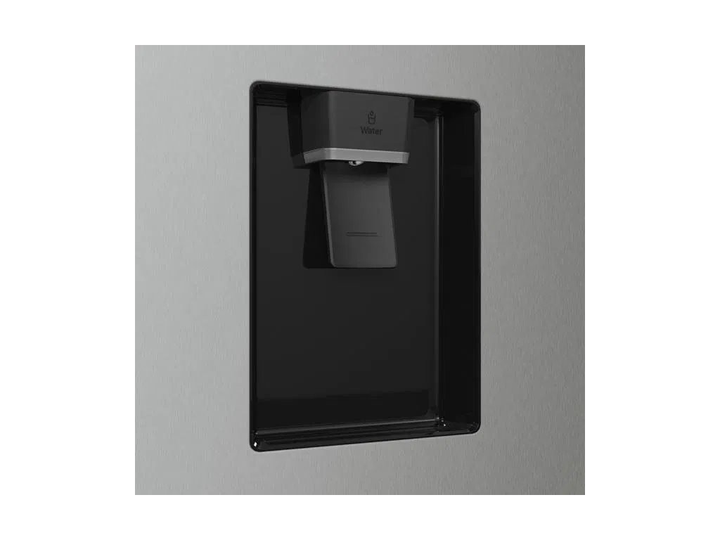 Americká lednička dvoudveřová side by side, dávkovač vody, barva nerezová, objem 355/192 litrů, energetická třída E, Total No Frost, LED osvětlení a displej, hlučnost 37 dB, funkce FastFreeze a Holiday, šířka 91,5 cm, výška 178,6 cm.
