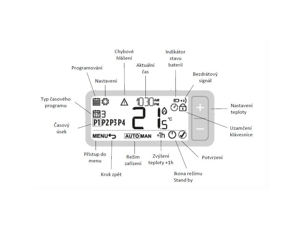 Toto usnadňuje programování a používání. Používané a cílové žádané hodnoty jsou snadno viditelné a interakce s termostatem je prostřednictvím malého počtu dotykových tlačítek.