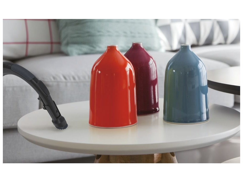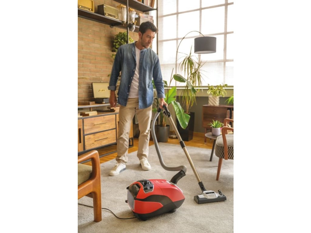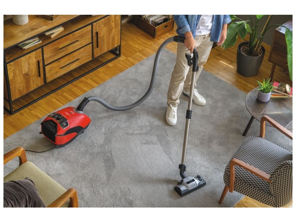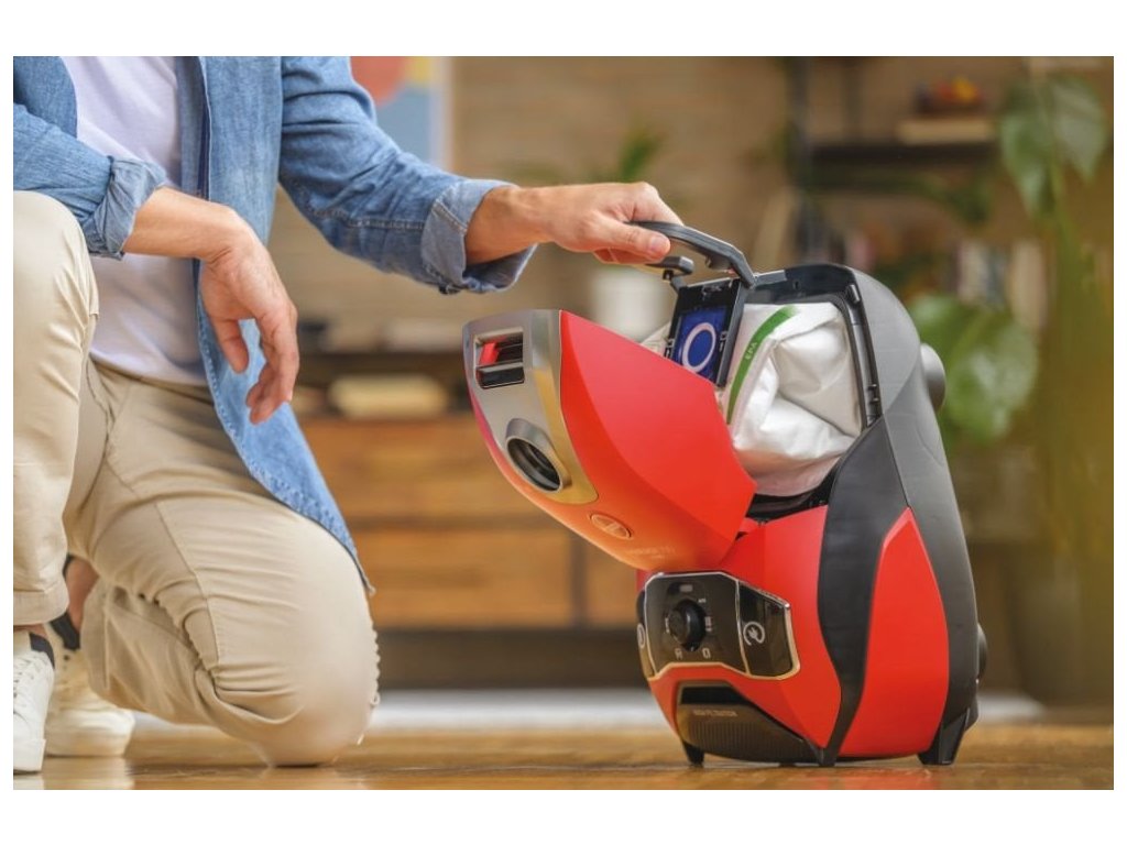 Sáčkový vysavač, barva tulipánově červená s technickou šedou, maximální příkon: 850 W, hlučnost 64 dB(A), teleskopické prodlužení trubice s obousměrným vytažením, XL EPA sáček 5 l, omyvatelný filtr antibakteriální EPA 10, dosah 9,5 m.