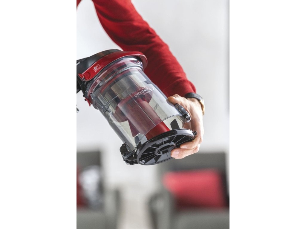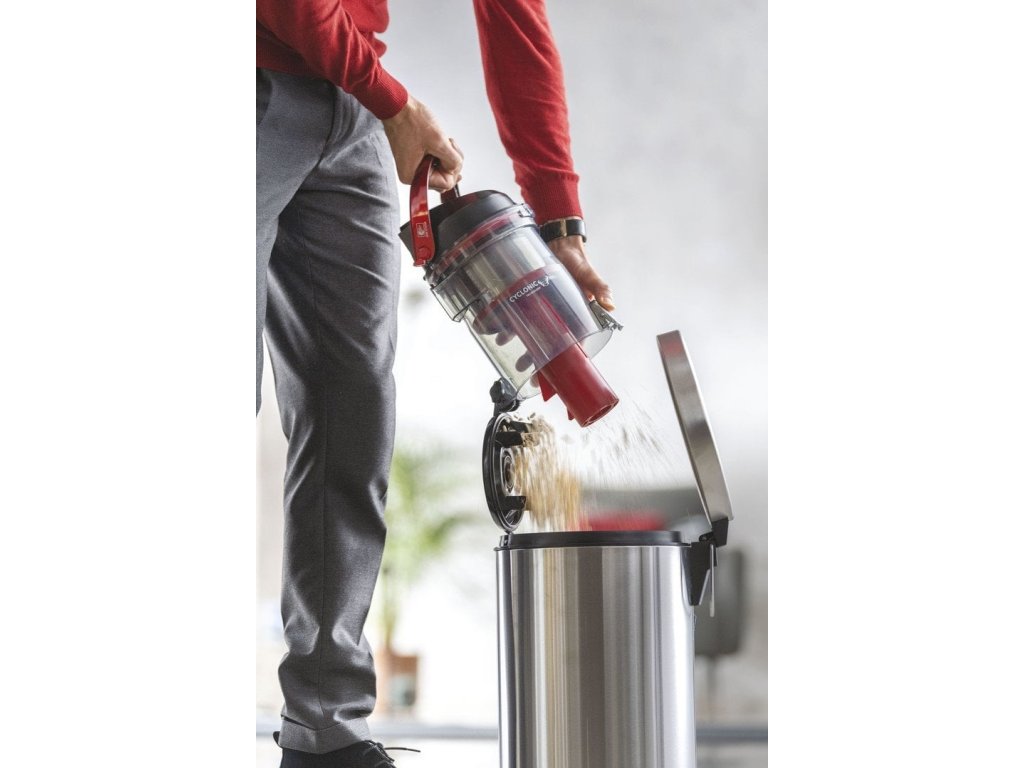 Bezsáčkový vysavač, barva černá s metalicky červenou, maximální příkon 850 W, hlučnost 68 dBA, objem nádoby na prach 2 l, systém separace prachu - samostatný cyklón technologií samostatného čištění Self Dust Clean, omyvatelný HEPA 13 filtr, dosah 10 m.