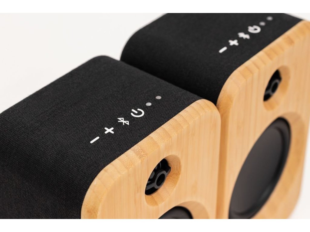 Reproduktory s Bluetooth konektivitou, jeden reproduktor napájen ze sítě, druhý s baterií na 25 hodin, USB-C nabíjení, RCA a AUX vstupy, z udržitelných materiálů, černé s prvky dřeva