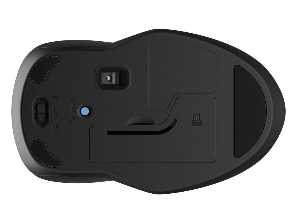 Bezdrátová myš • Duální připojení (2,4 GHz USB adaptér / Bluetooth) • Optický snímač 1600 DPI • Univerzální pro praváky i leváky • Napájeno 1x AA baterií • Černá
