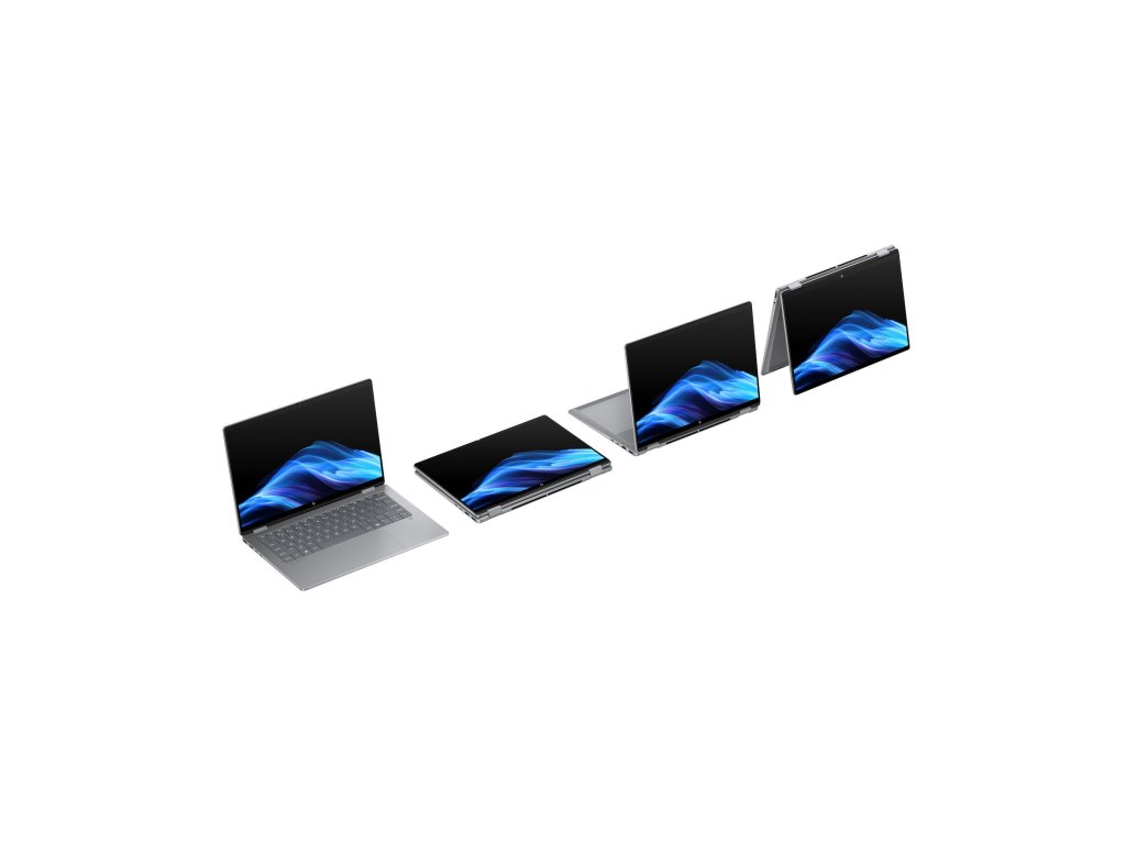 Konvertibilní AI PC • Stříbrná • Win 11 Home • AMD Ryzen AI 5 340 (Krackan Point) • AMD Radeon 840M Graphics • 16 GB RAM • 1 TB SSD • 14" WUXGA IPS dotyk. • Wi-Fi 7, BT 5.4 • IR 5MP kamera • Hmotnost 1,40 kg • Pero v balení