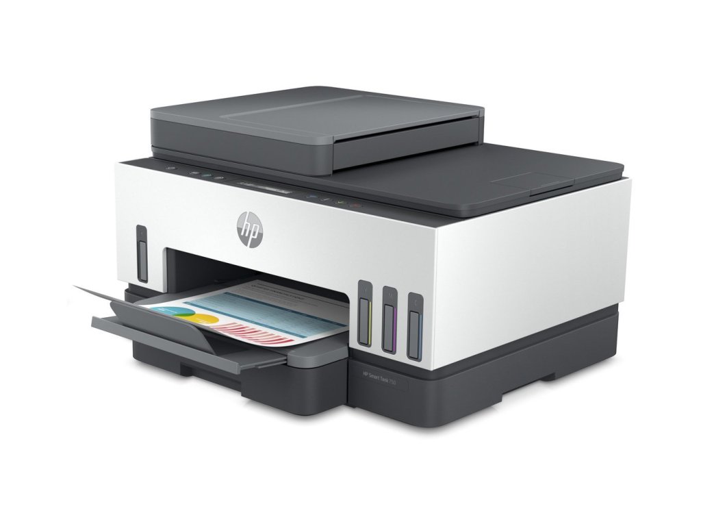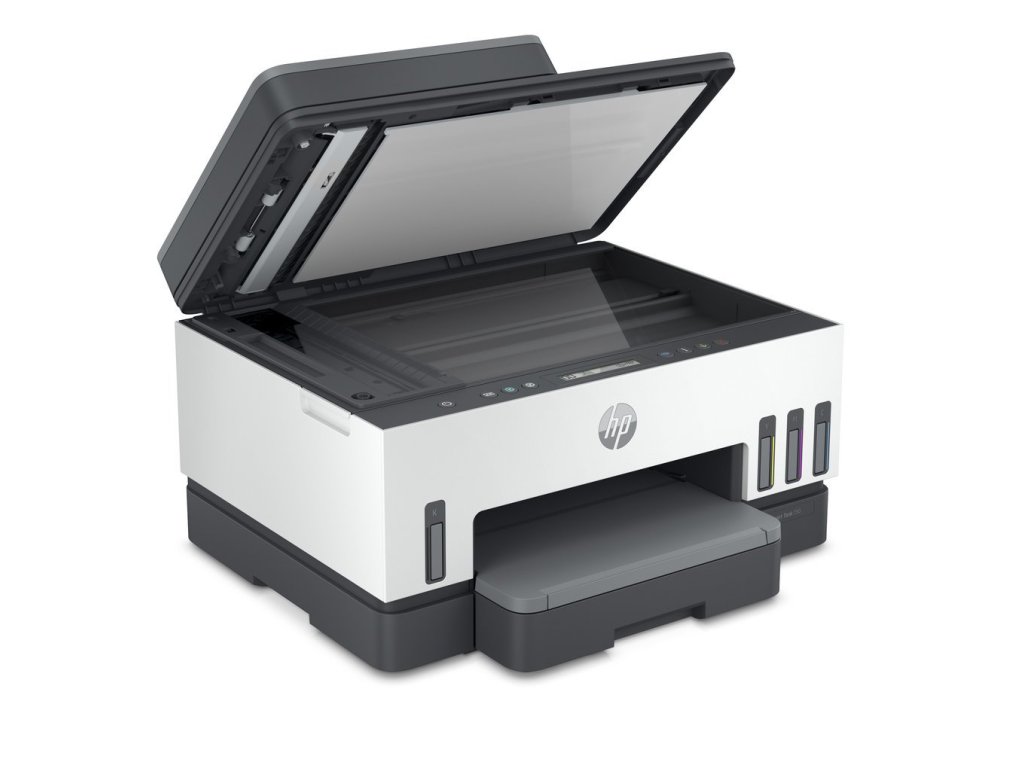 HP Smart Tank 7605 All-in-One • barevná multifunkční inkoustová tiskárna s tankovým systémem • A4 • tisk, skenování, kopírování • 15/9 str./min (čb/bar.) • USB 2.0, dvoupásmová Wi-Fi, Ethernet • automatický duplex • ADF • vstup 250 listů • tisk bez okrajů