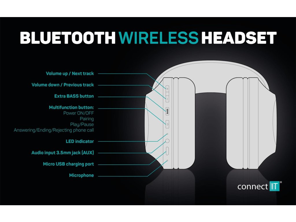 HYPERBASS BASS+ bezdrátová sluchátka s mikrofonem, ČERNÁ