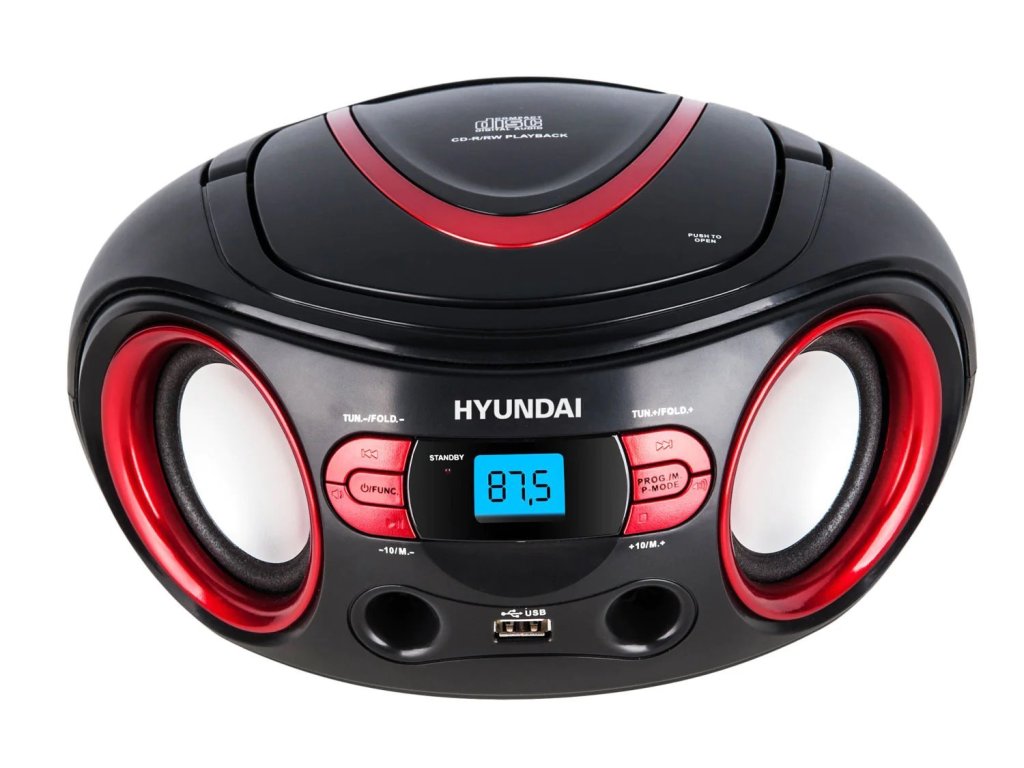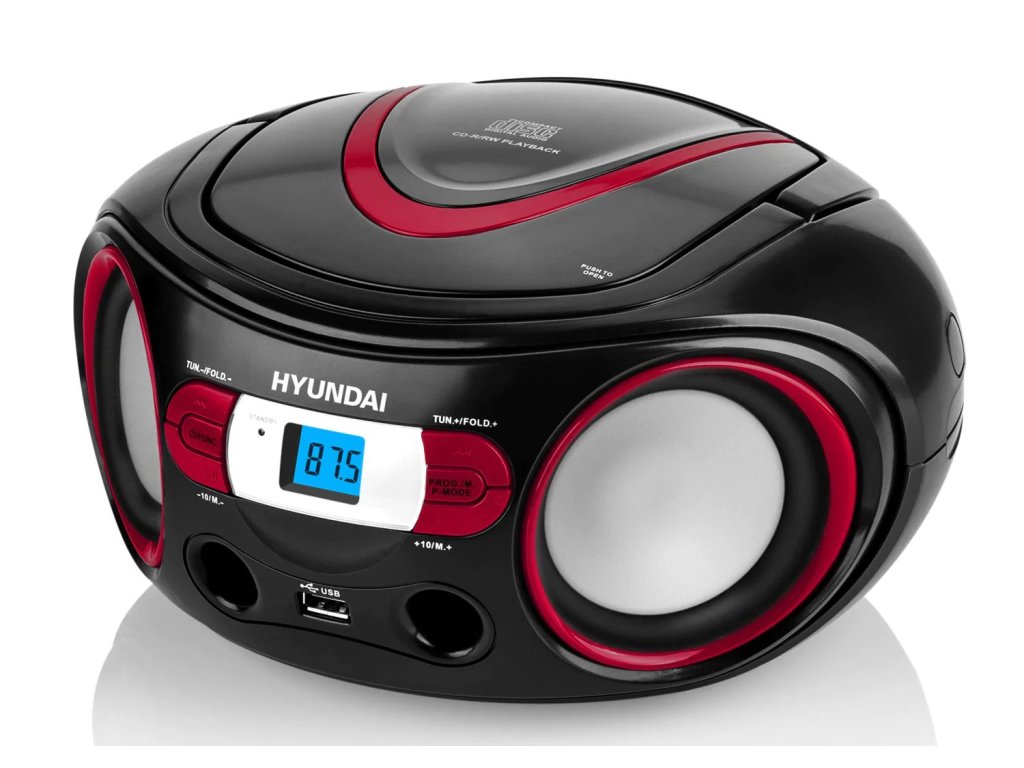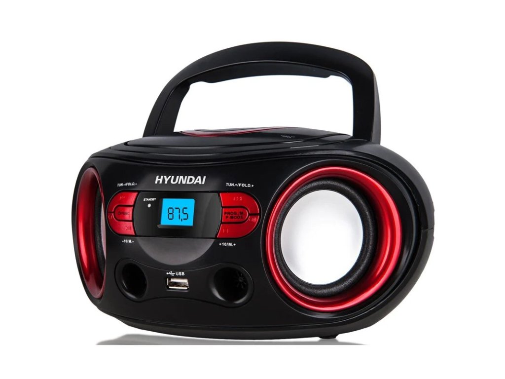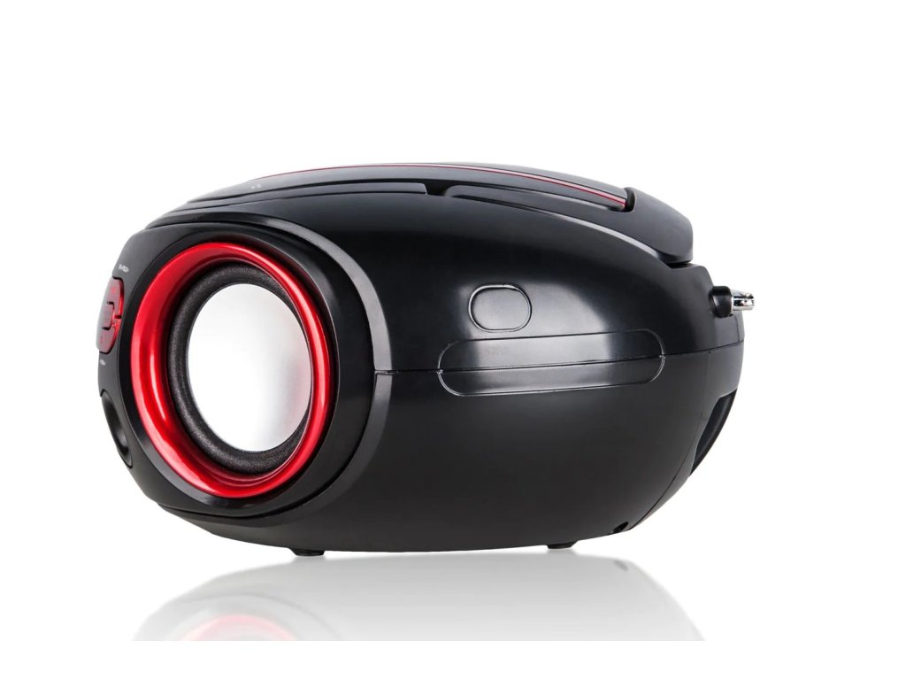 Radiopřijímač, LCD displej, digitální FM tuner, 30 předvoleb, přehrává CD-R/RW, podpora formátů MP3, WMA, USB vstup, AUX vstup, sluchátkový výstup, výstupní výkon 2 x 1,2 W, černý/červený