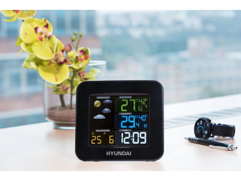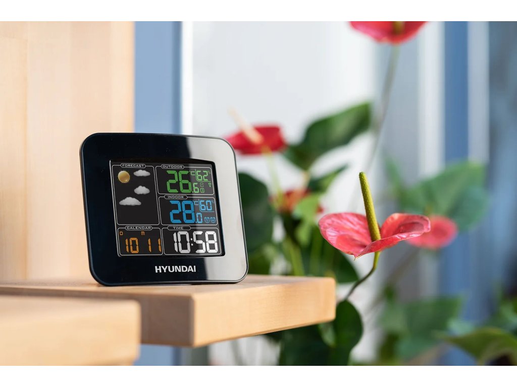 Domácí meteorologická stanice Hyundai WS8446 zaujme na první pohled elegantním designem a barevným displejem. Na něm lze rychle a snadno nalézt všechny potřebné a důležité údaje. Přesný čas je řízen radiovým signálem DCF 77. Stanice zobrazuje také aktuální datum a nastavit lze i budík.