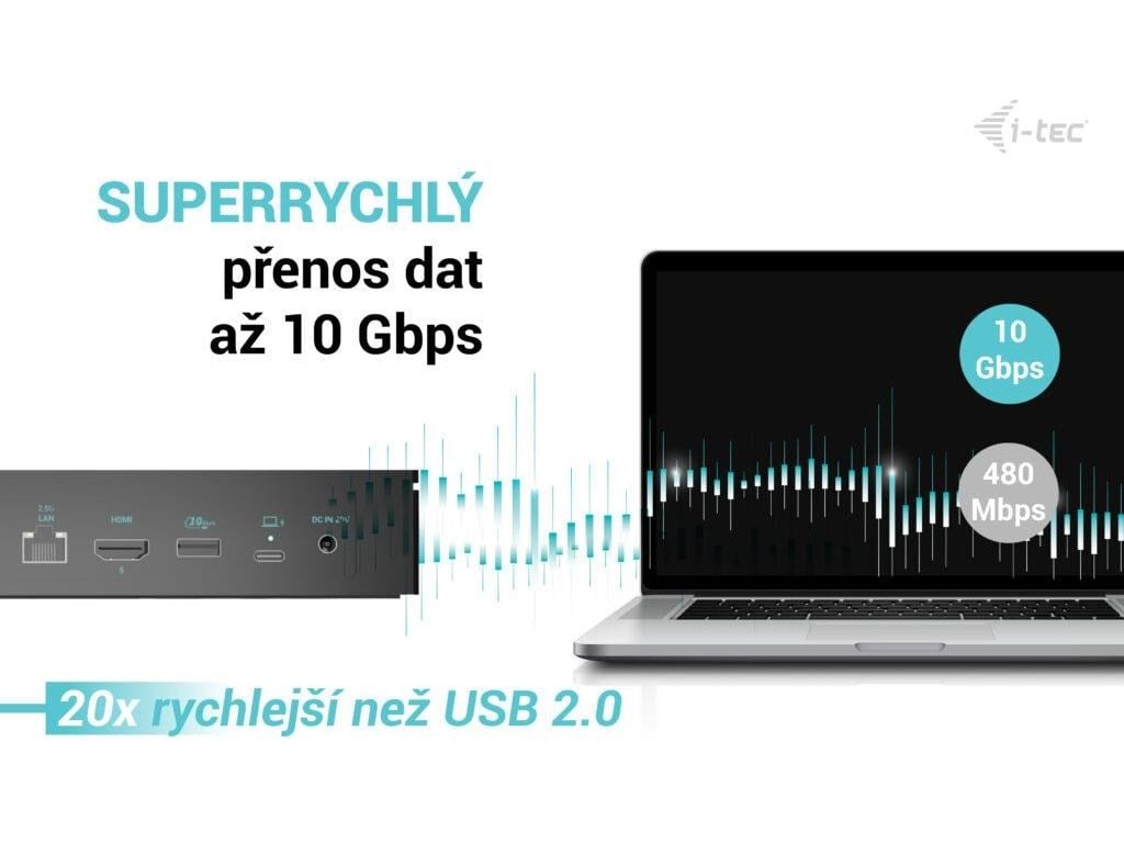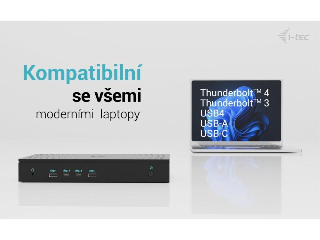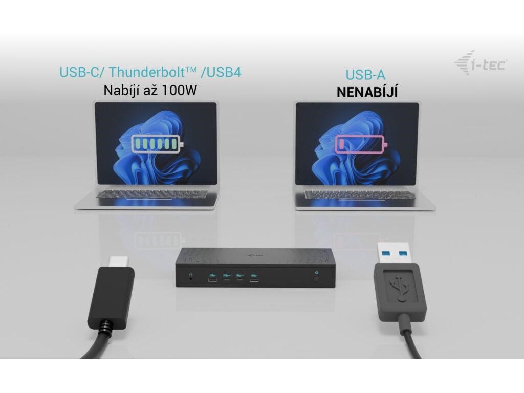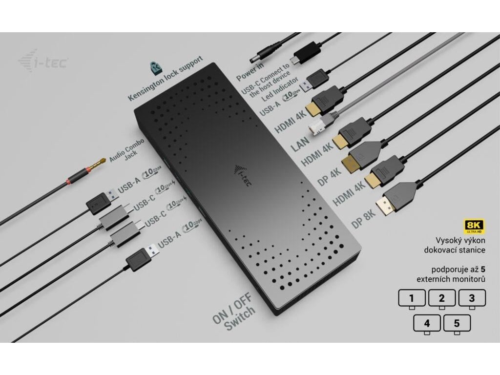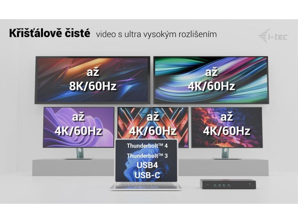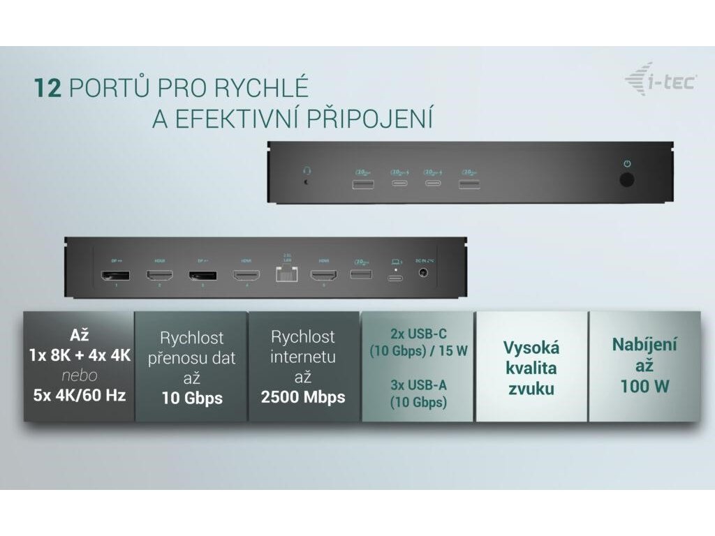 Dokovací stanice i-tec 5×4K/60Hz s napájením 100 W, podpora až 5 monitorů, 2,5 Gb LAN, 5× USB (2× USB-C), VESA montáž, univerzální kompatibilita.