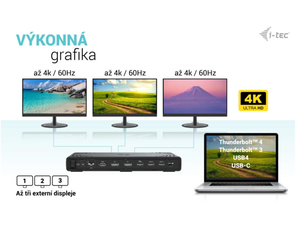 Vysoce výkonná dokovací stanice USB-C nové generace, která podporuje výstup až na tři externí monitory ve vysokém rozlišení až 4K. Dokovací stanici lze používat prakticky se všemi notebooky vybavenými porty USB-C, USB4 a Thunderbolt“ 3/4 a zároveň podporuje všechny běžné současné operační systémy.