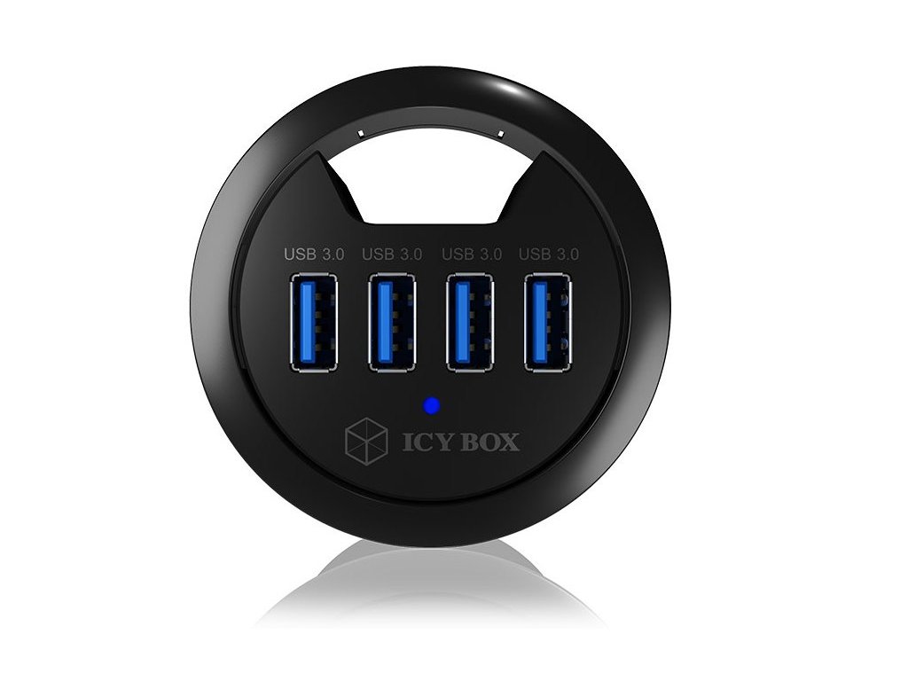 IB-HUB1403 firmy ICY BOX je čtyřportový USB hub, který se přesně vejde do otvorů, které v sobě mívají kancelářské stoly. Nepotřebujete nic lepit, ani vrtat - Hub do něj jednoduše vložíte a můžete jej začít používat. Nové výhody s sebou často přinášejí také nové nevýhody - to ovšem není případ IB-HUB1403, protože i se čtyřmi porty stále ponechává prostor v původním otvoru, tak aby dále plnil i svou prvotní funkci.