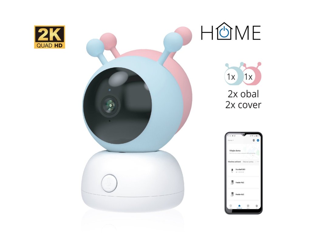 Bezdrátová vnitřní chůvička s teploměrem, vlhkoměrem, přehráváním meodií, přenosem zvuku a detekcí pláče, automatickým následováním a detekcí pohybu, dvěma vyměnitelnými kryty v balení, a vysokým rozlišením 2K (3 MPx)