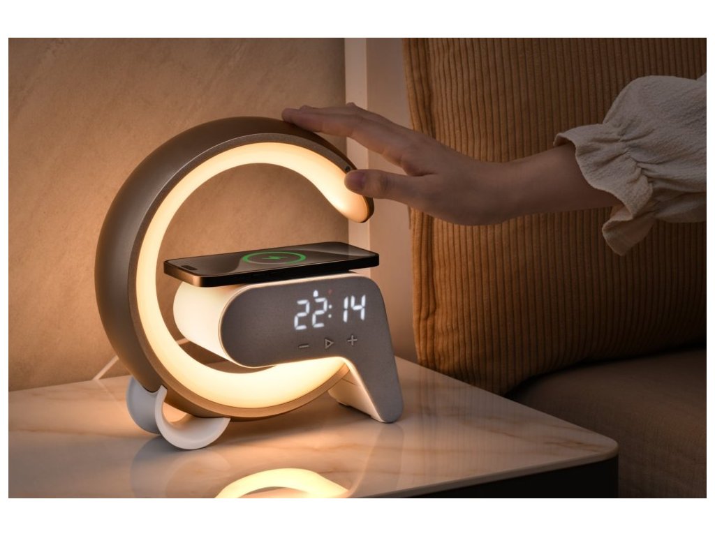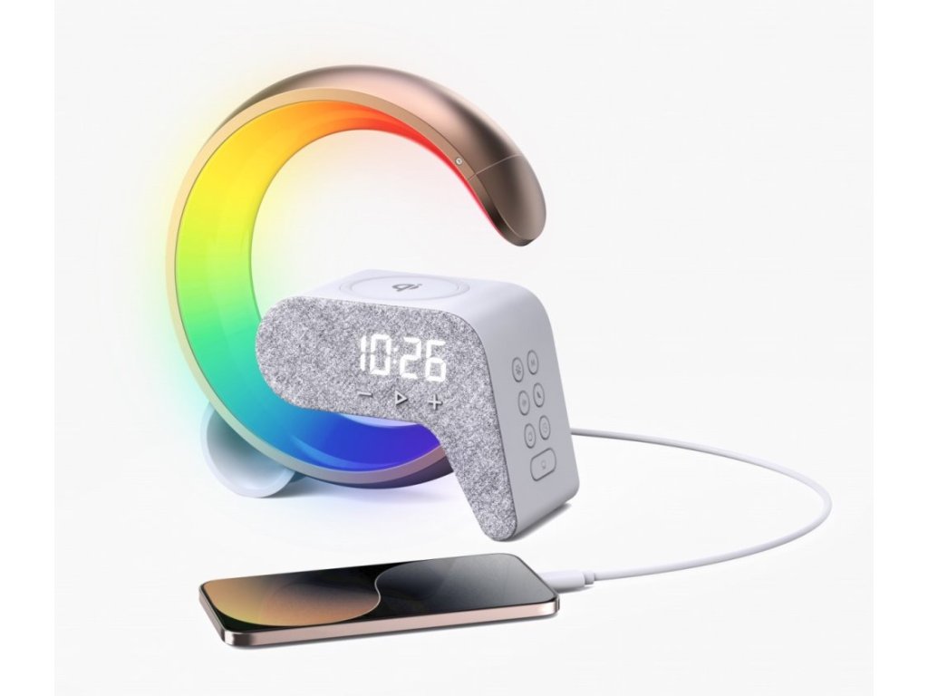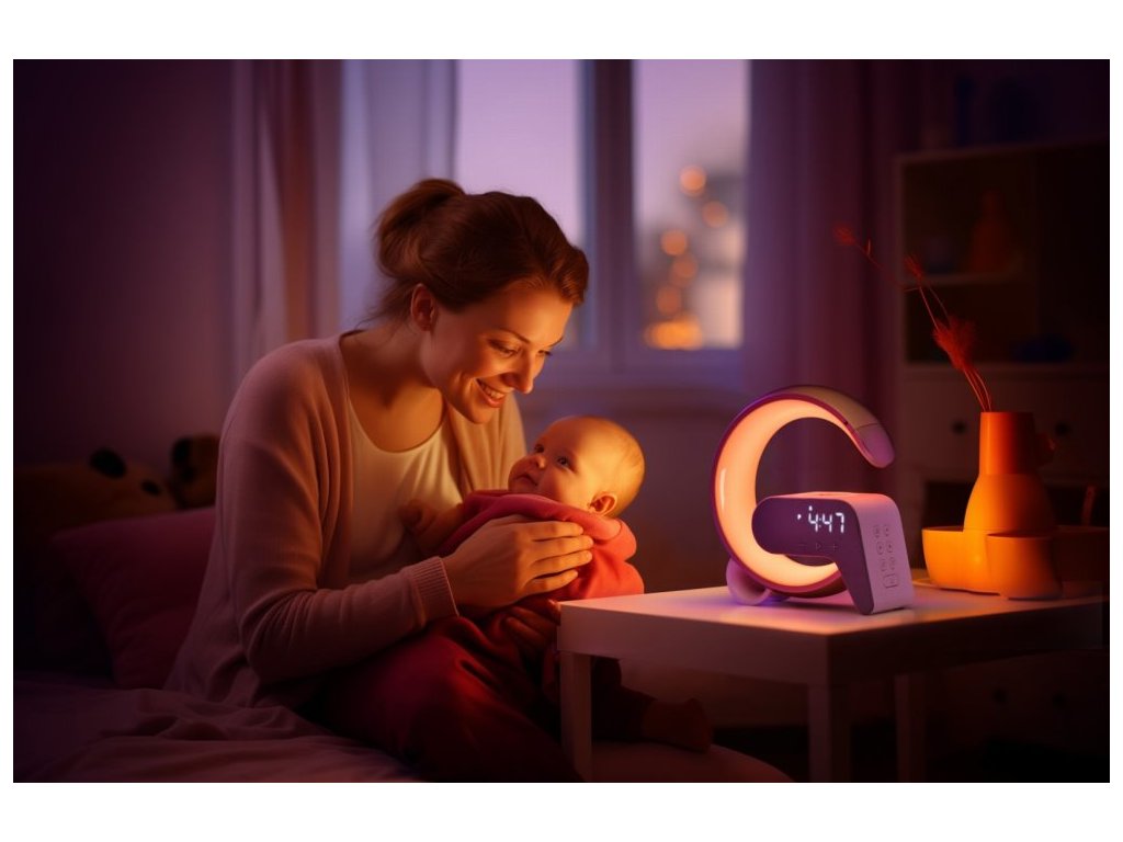 Netradiční LED stolní lampička s praktickým digitálním displejem a s efektním RGB podsvícením. Nabízí teplý odstín světla a plynulé stmívání. Tato lampička je ideální do dětských pokojíčků díky možnosti přehrávání šesti různých přírodních zvuků či bílého šumu k večernímu zklidnění. LED displej disponuje možností ztlumení i úplného vypnutí. Pro přehrávání hudby z mobilního zařízení bez nutnosti připojení kabelu je připraven Bluetooth reproduktor. K dispozici je navíc i duální budík pro dva různé časy probuzení, bezdrátová nabíječka standardu Qi a nabíjecí USB port pro nabíjení mobilních telefonů.