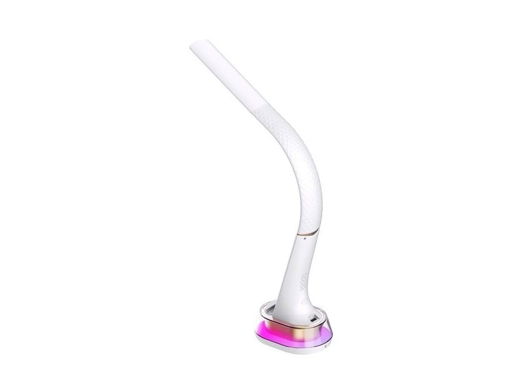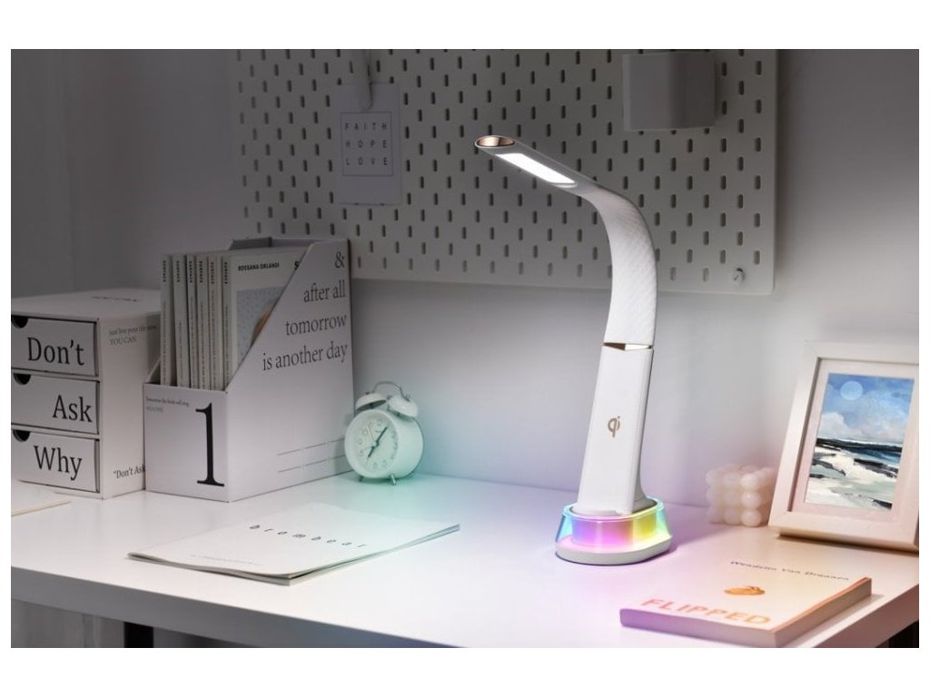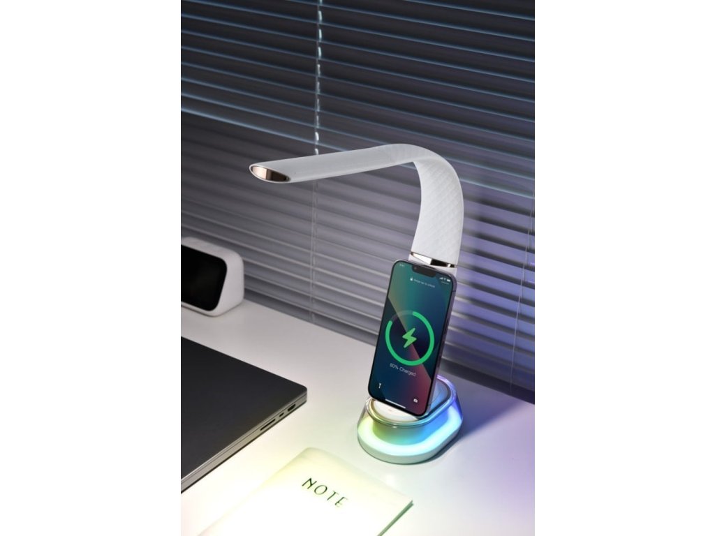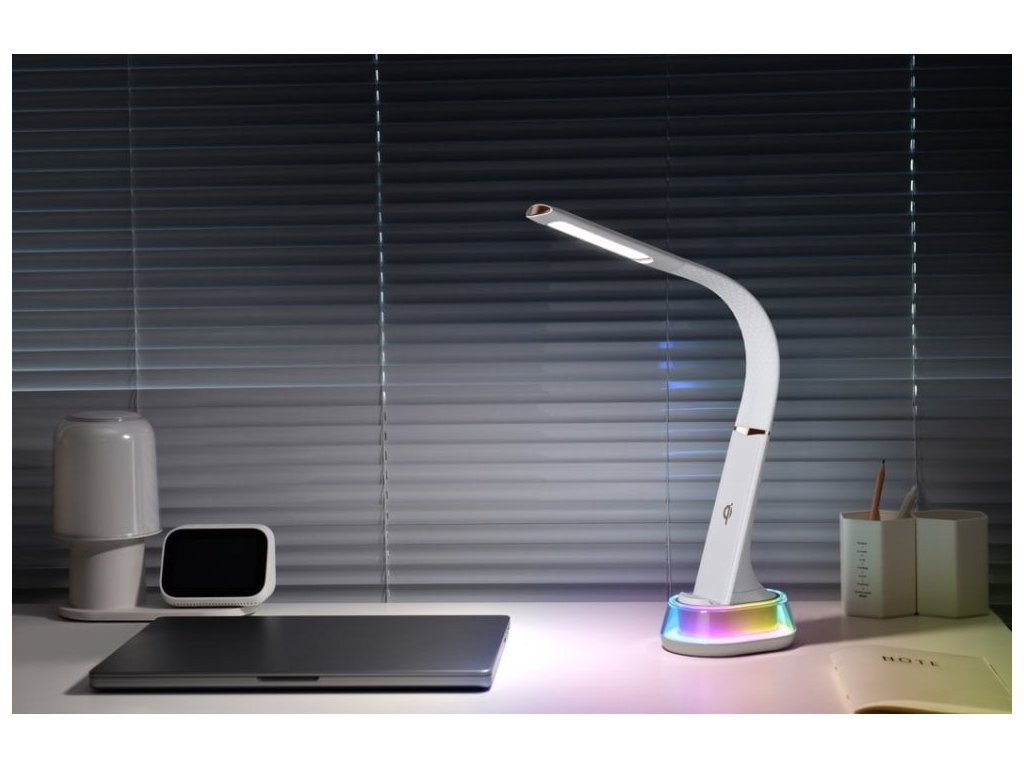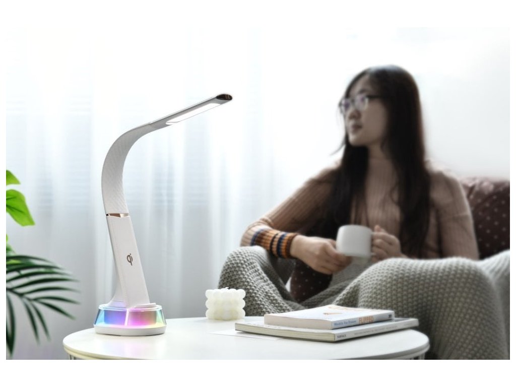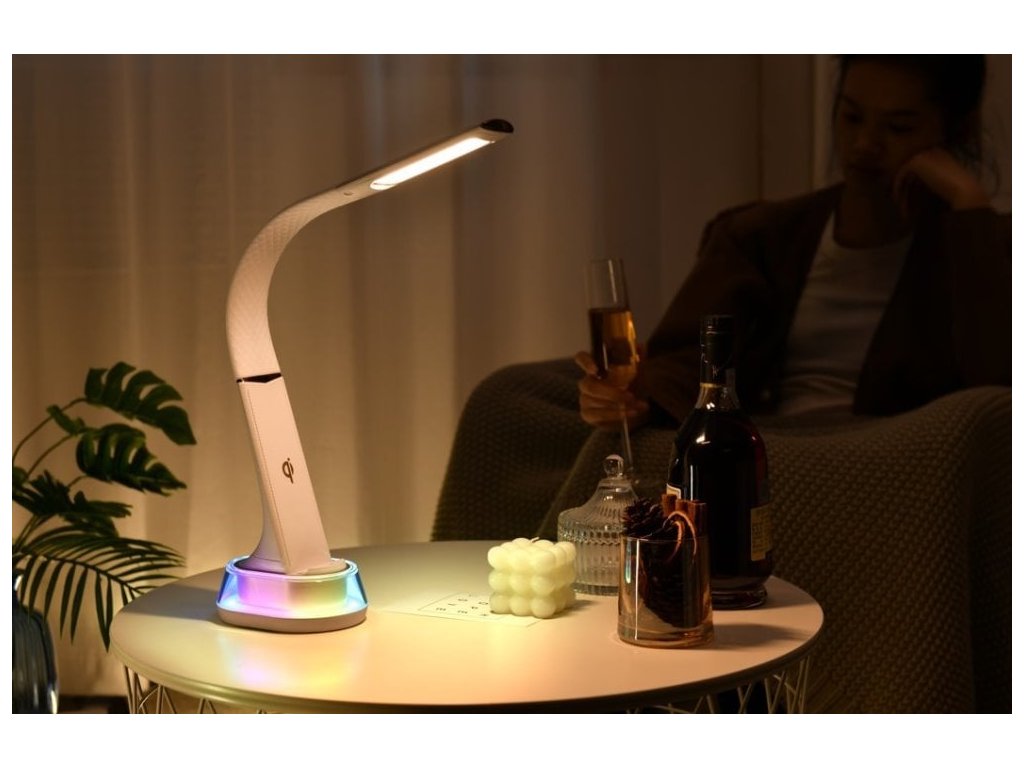 Praktická stolní lampička s pokročilou LED technologií, ohebným ramenem a moderním designem. Bílá imitace kůže v kombinaci se zlatými prvky z ní dělá stylový vizuální doplněk, vhodný například pro studentský pokoj či domácí kancelář. Nastavení intenzity osvětlení i barevné teploty probíhá pomocí dotykového tlačítka. Noční RGB podsvícení se 3 volitelnými světelnými módy pomáhá vytvořit příjemný světelný podtón v místnosti a zároveň skvěle doplňuje celkový vzhled lampičky. Dále je k dispozici bezdrátová nabíječka standardu Qi s výkonem 10 W a nabíjecí USB port. Mobilní telefon s podporou bezdrátového nabíjení se začne nabíjet při pouhém položení na nabíjecí plochu.