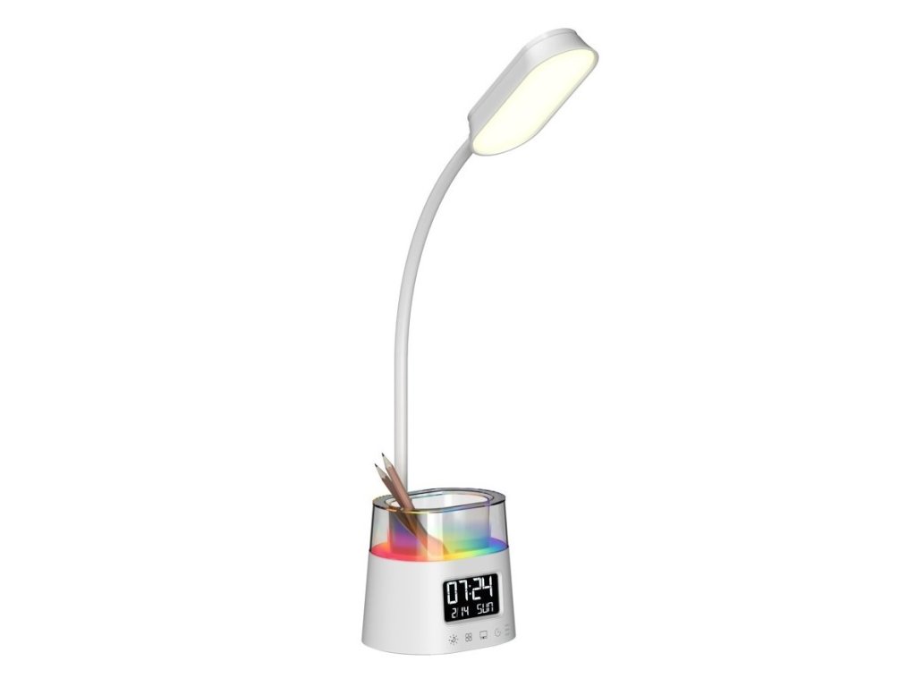 Stolní lampička, LED, 10W, teplá–studená bílá + RGB podsvícení, 350lm, držák na tužky, LED displej, hodiny, bílá
