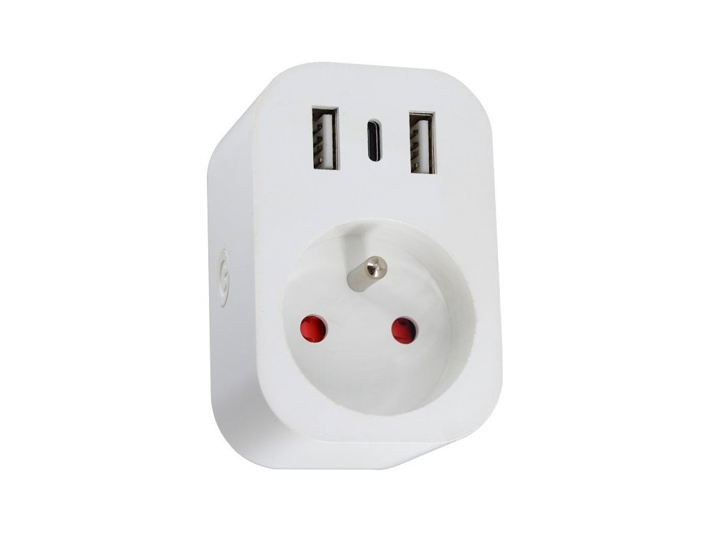 Zásuvka, vnitřní, pro chytrý dům, jedna zástrčka, 2× USB, 1× USB-C, Wi-Fi, ovládání přes aplikaci, podporuje Android a iOS, bílá