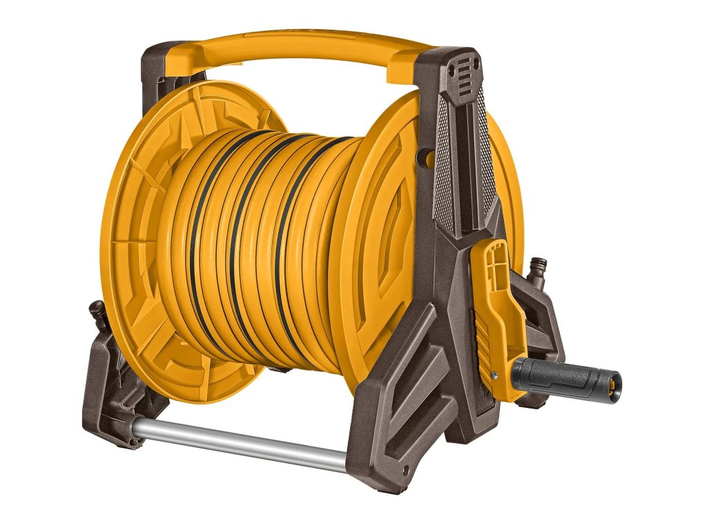 Naviják je navržen s prodlouženým a zvětšeným držadlem, které má ochranu proti přiskřípnutí, a silnými držáky pro stabilní upevnění hadice. Velkokapacitní vnitřek umožňuje ukládat hadici tak, aby byla vždy uklizená a snadno použitelná. Materiály jako polypropylen (PP) a hliník zaručují odolnost a dlouhou životnost produktu, což ocení každý zahradník i domácí kutil.