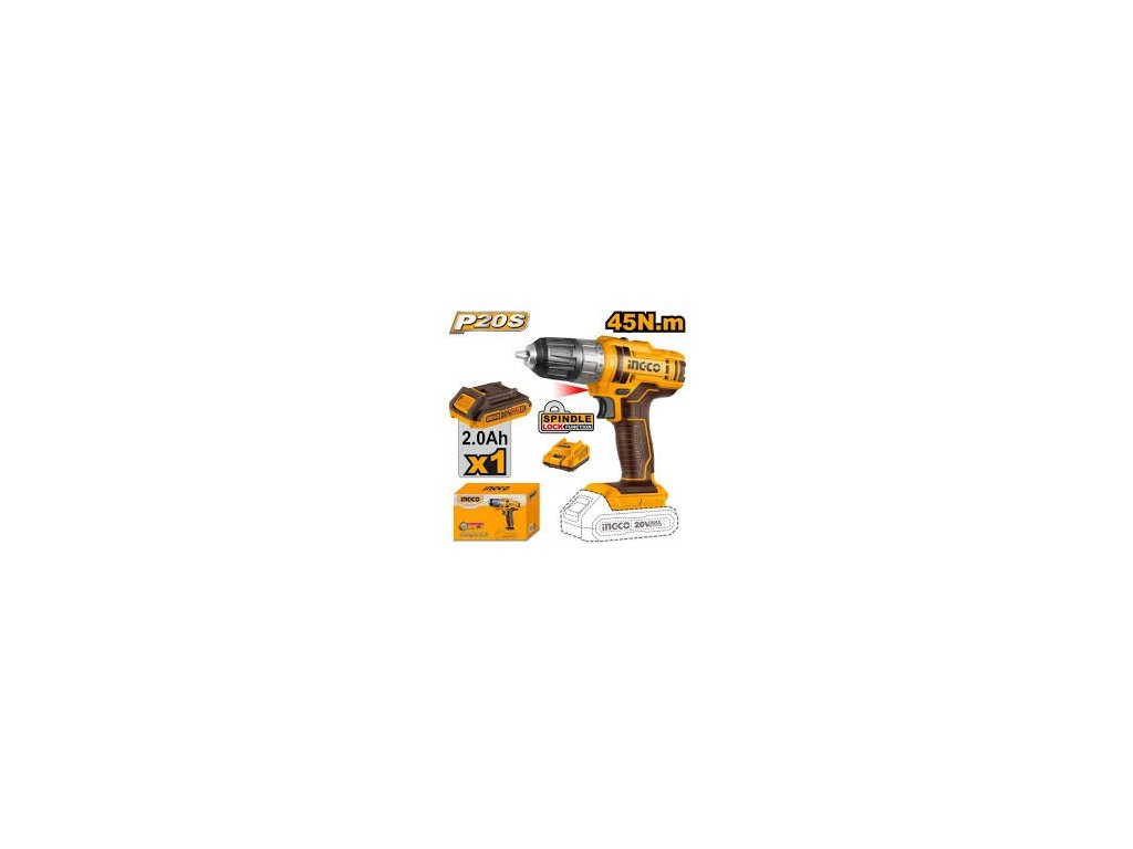 Akumulátorový šroubovák 20V, otáčky 0-400/0-1500 ot./min, max. točivý moment: 45 Nm, 1ks 2.0Ah baterie a nabíječka.
