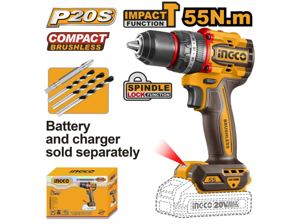 Ingco CIDLI205581 AKU šroubovák s příklepem, 55Nm, bez baterie a nabíječky
