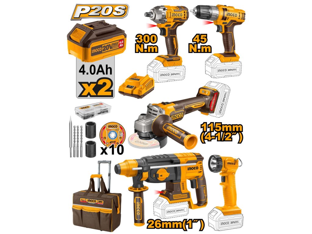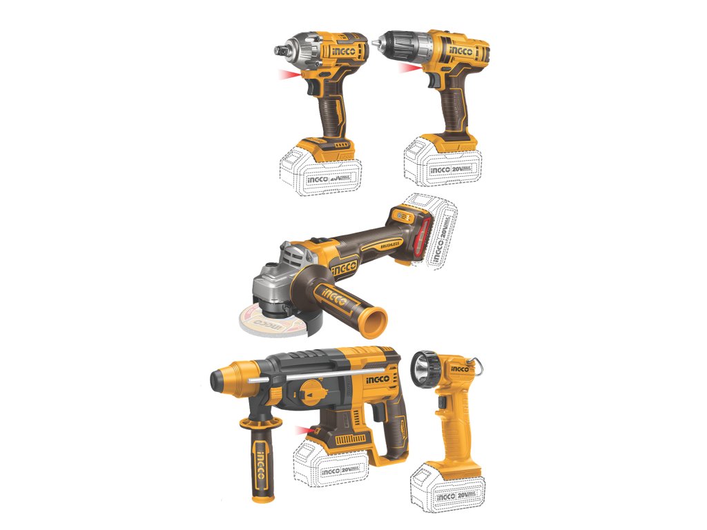 Výhodná sada obsahuje tyto stroje: 1x rázový utahovák, 1x aku šroubovák, 1x vrtací kladivo, 1x úhlová bruska, 1x pracovní lampa, 2x baterie 4.0Ah, nabíječka, taška po přepravu.