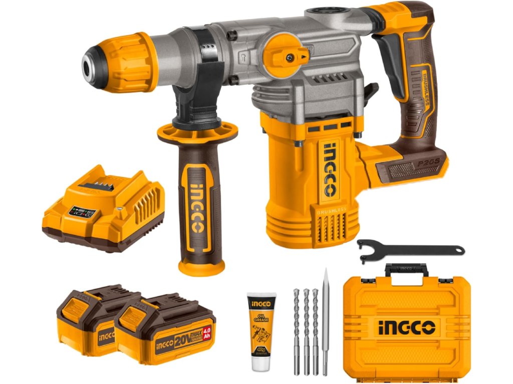 Akumulátorové vrtací kladivo, napětí 20V, počet úderů 0–4400, energie úderu 4,5J, sklíčidlo SDS Plus, vč. 2ks 4.0Ah baterie a nabíječky.