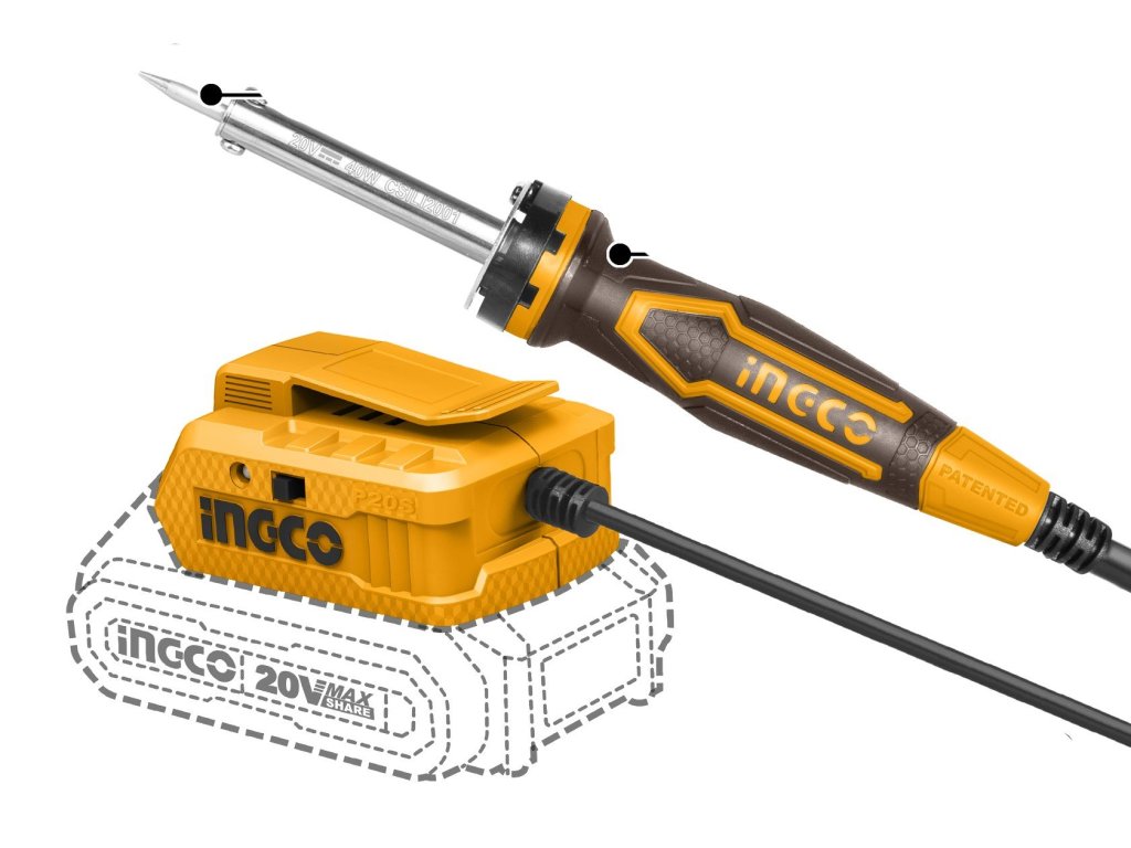 Pájka je dodávána bez baterie a nabíječky. Akumulátor lze použít ve všech typech nářadí řady Ingco P20S.
